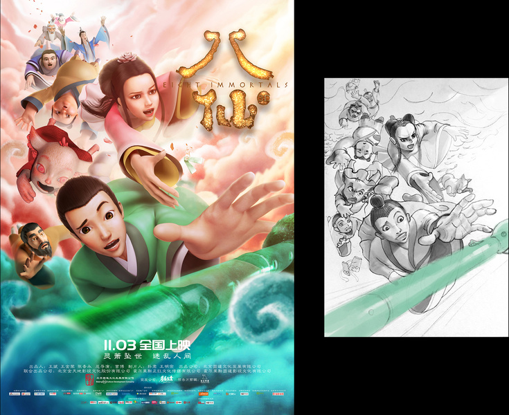 给哪吒魔童闹海的角色海报画的初版水墨概念设计