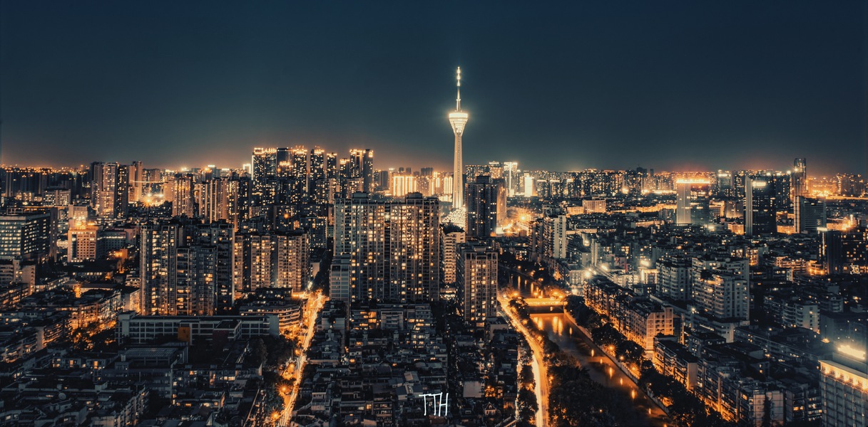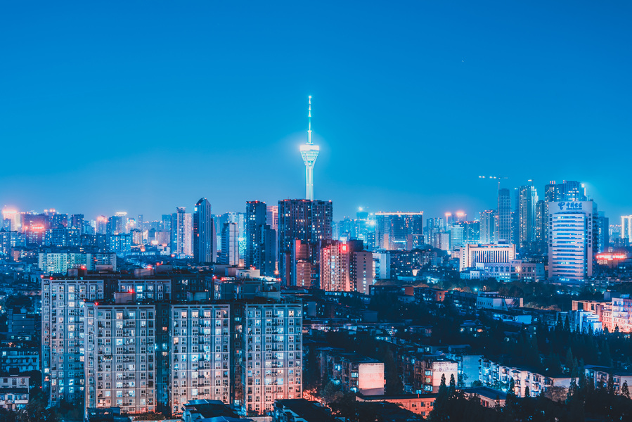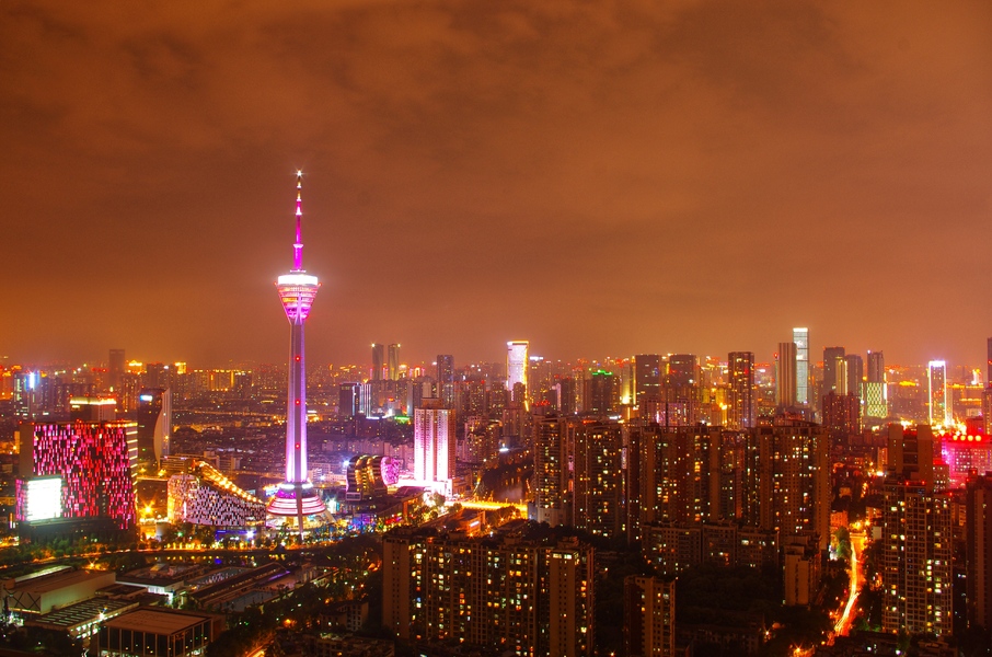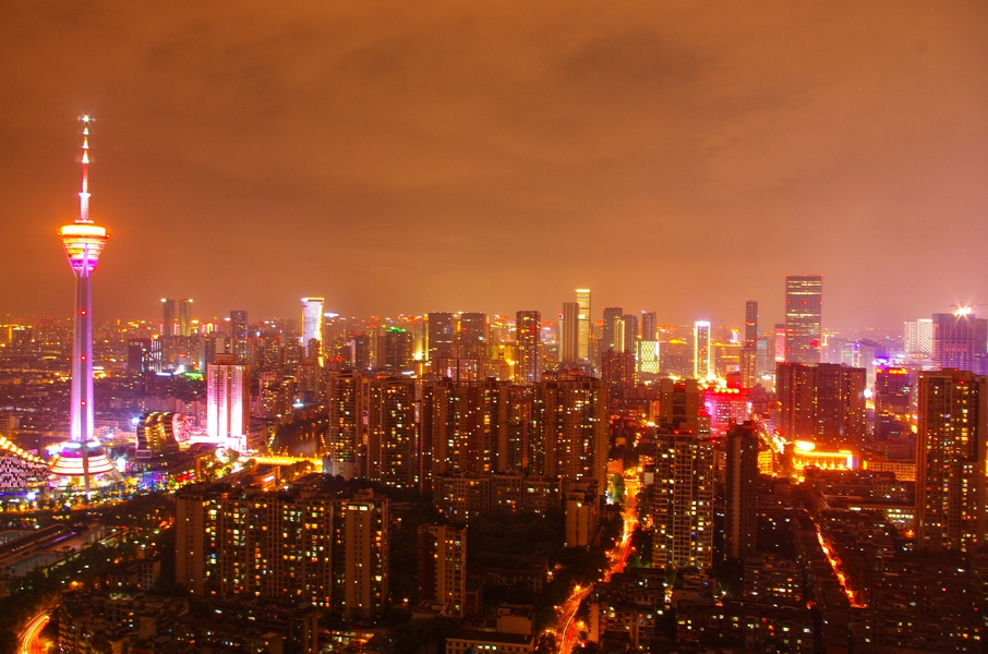 成都天府熊猫塔,傍晚到入夜2小时的色彩变化。