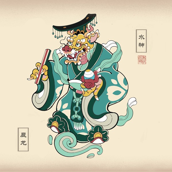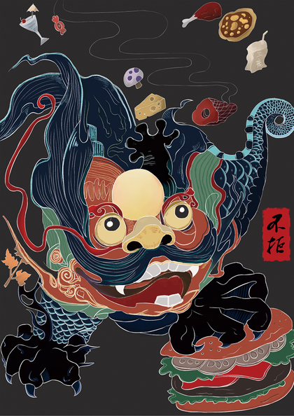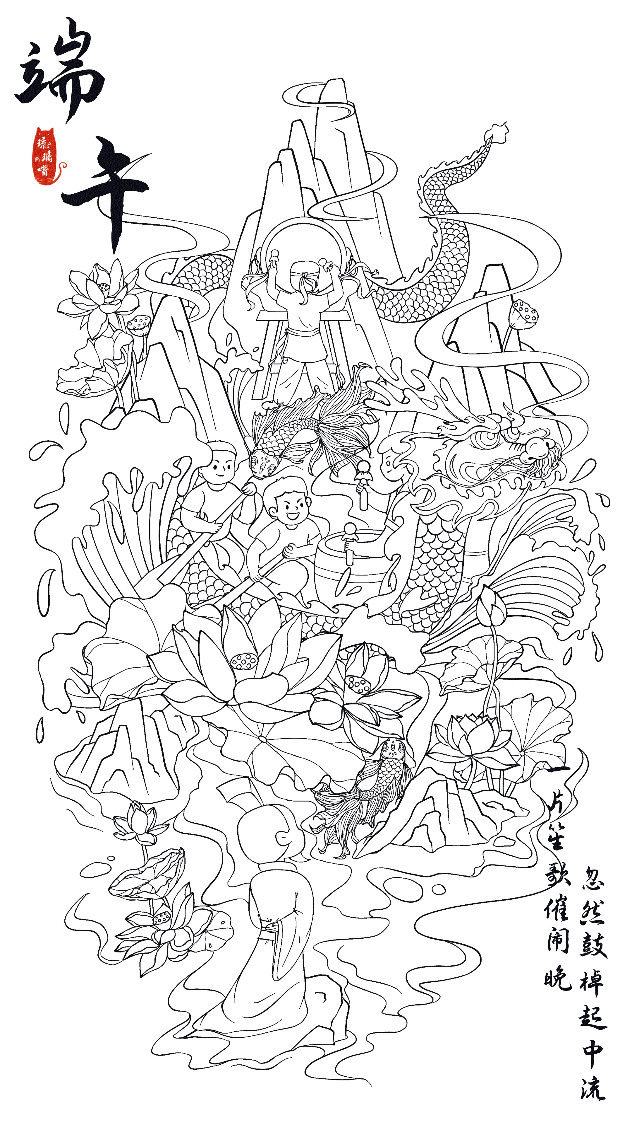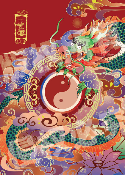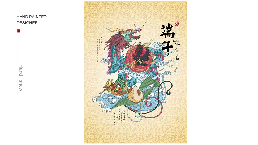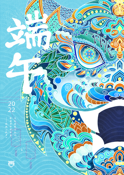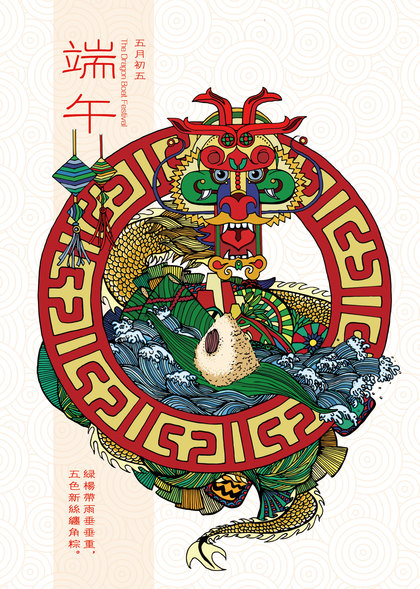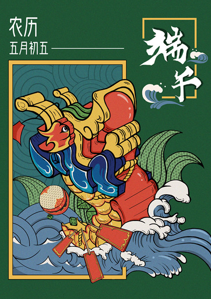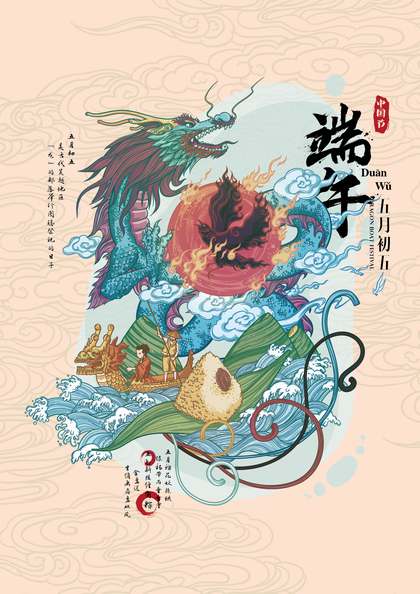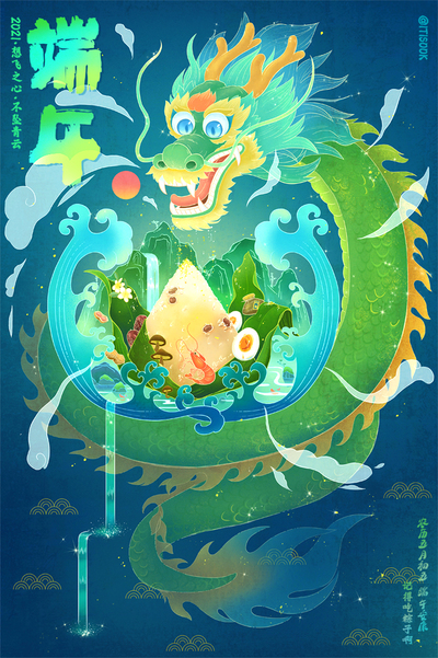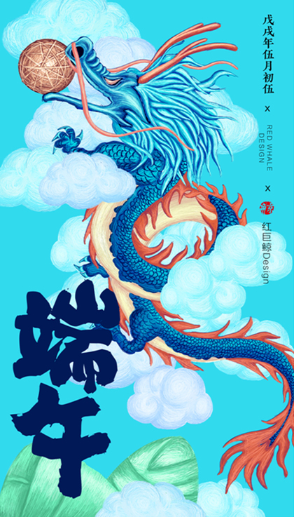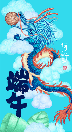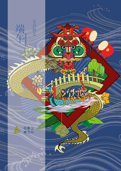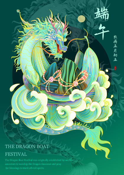 原创-端午节海报-青龙-粽子-中国风插画