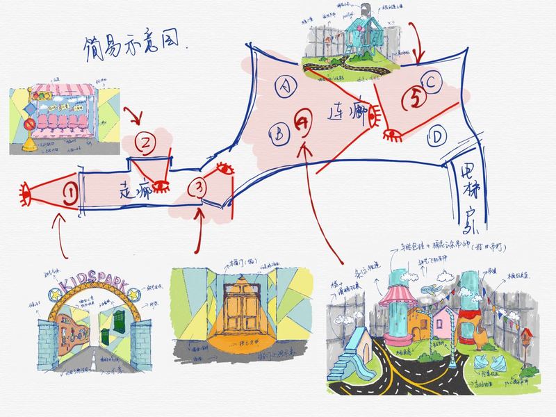 室内美陈 走廊空间美陈改造 儿童游乐区手绘概念稿