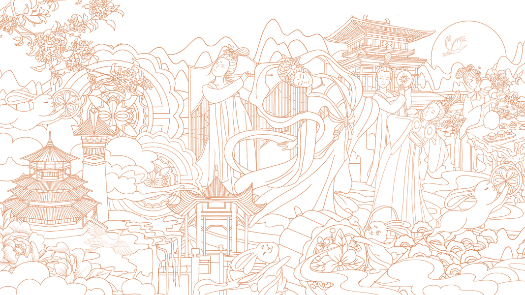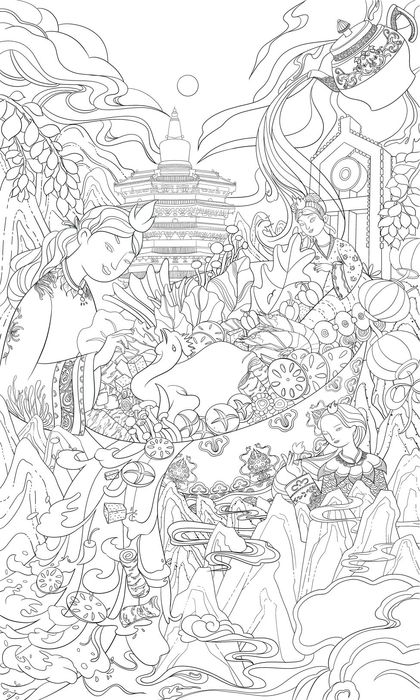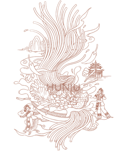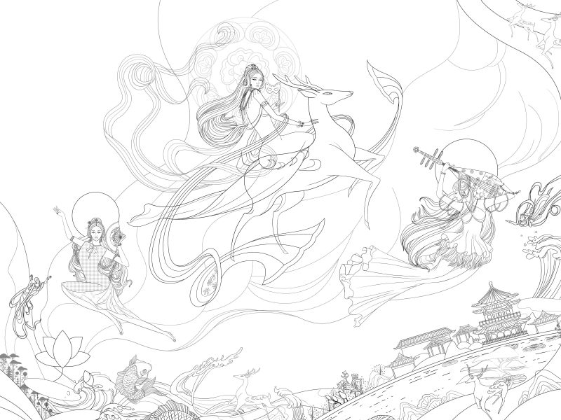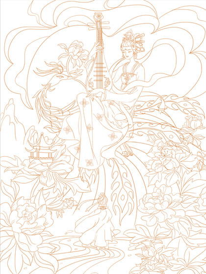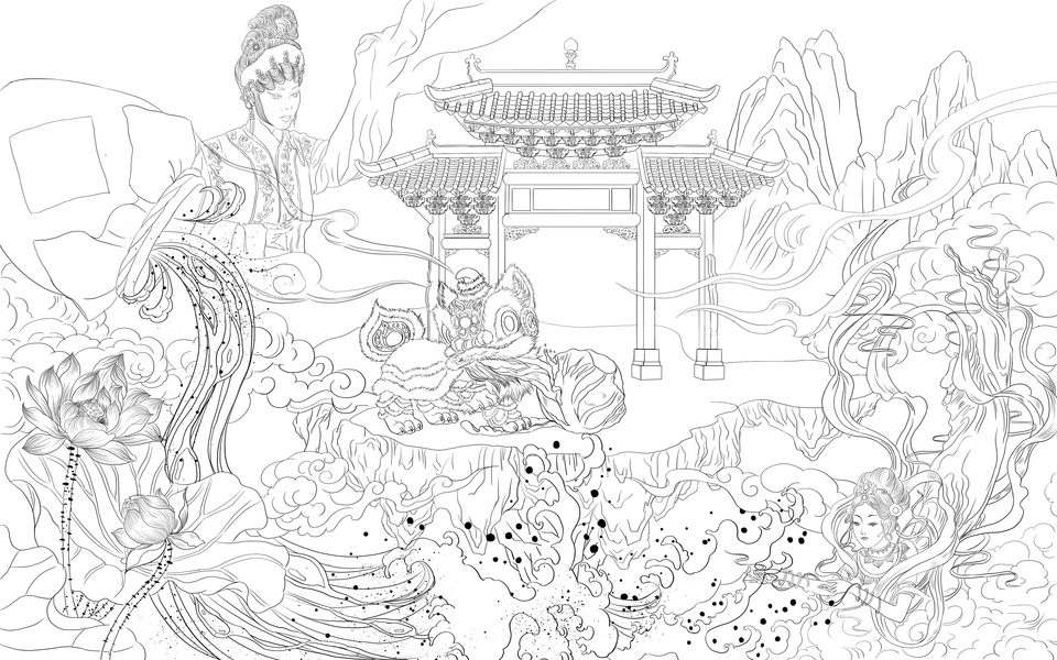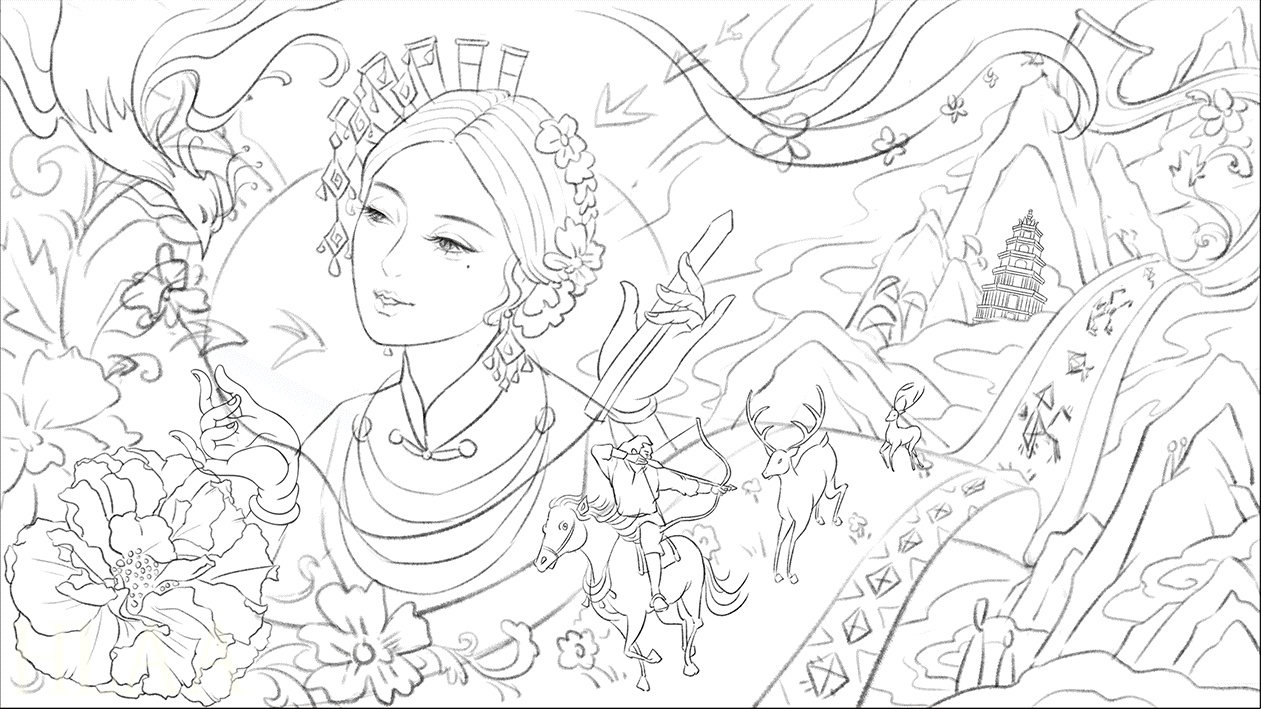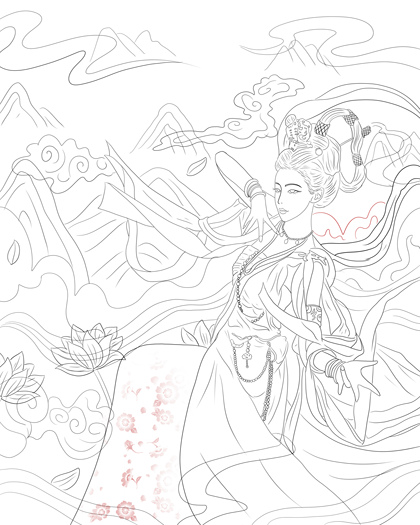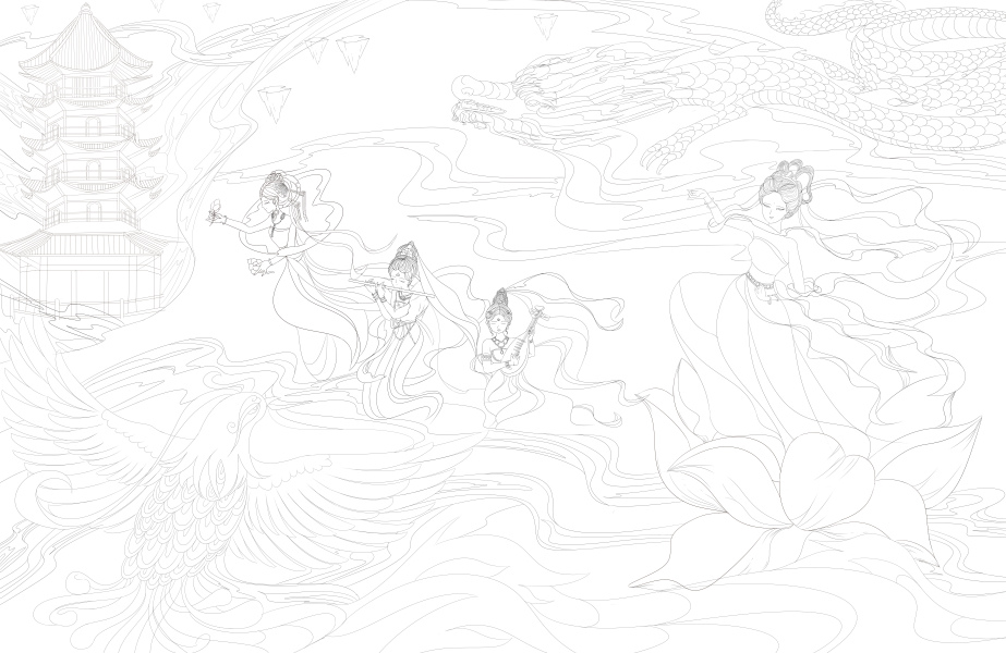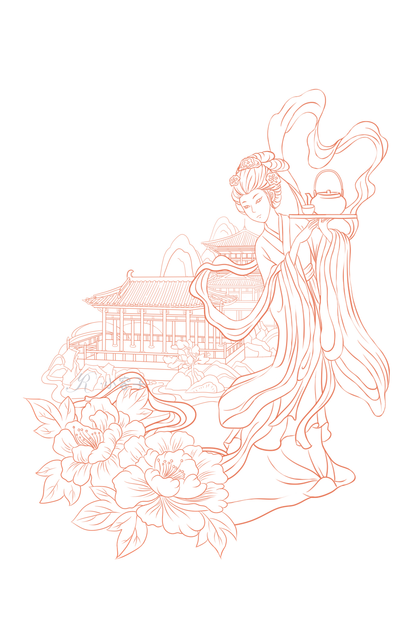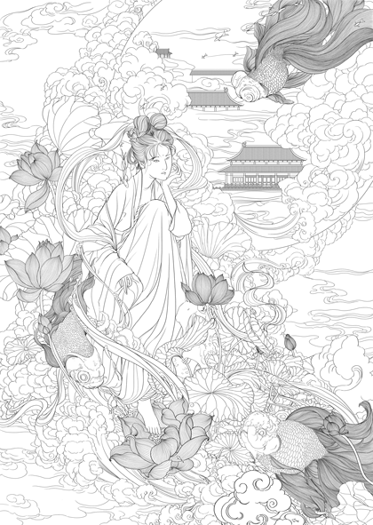 国潮插画---古风、建筑、荷花、佳丽、水流