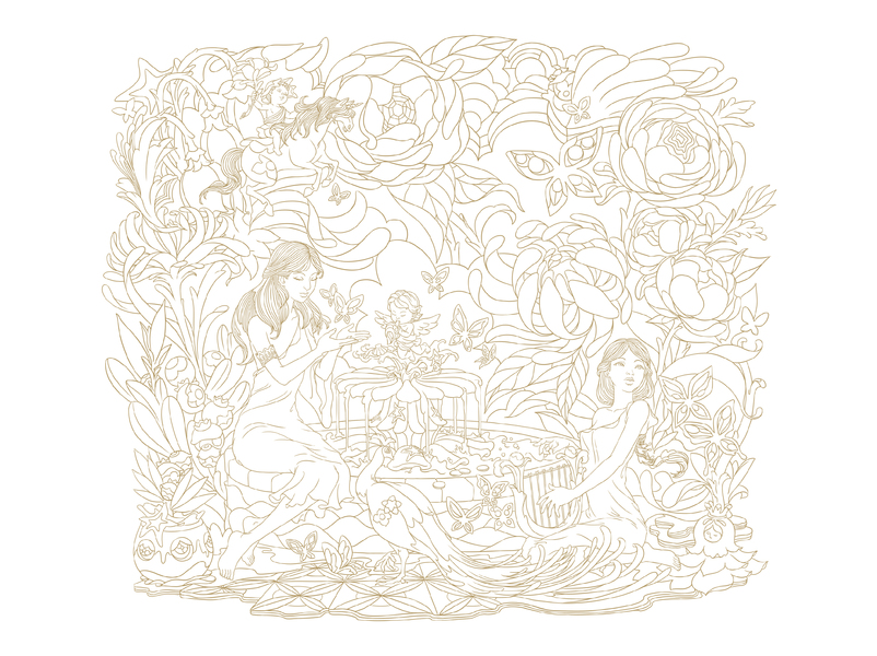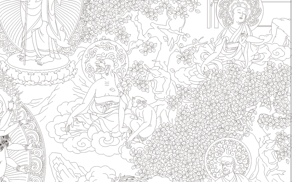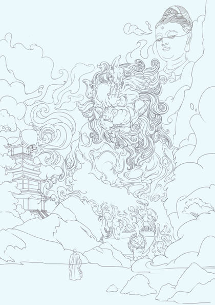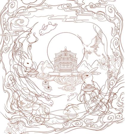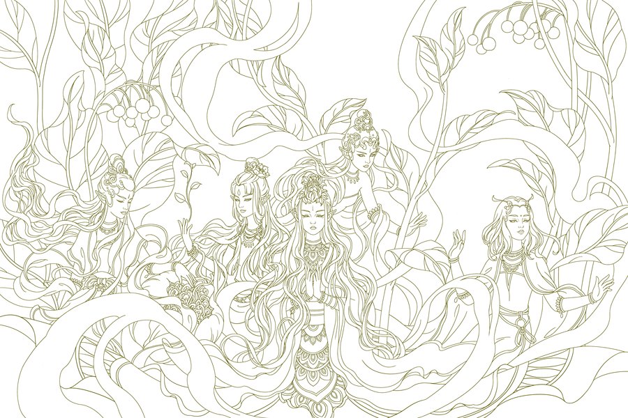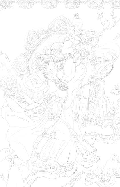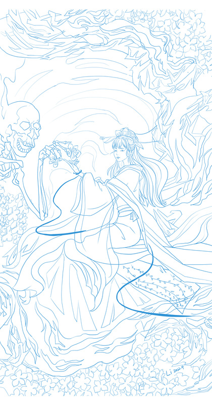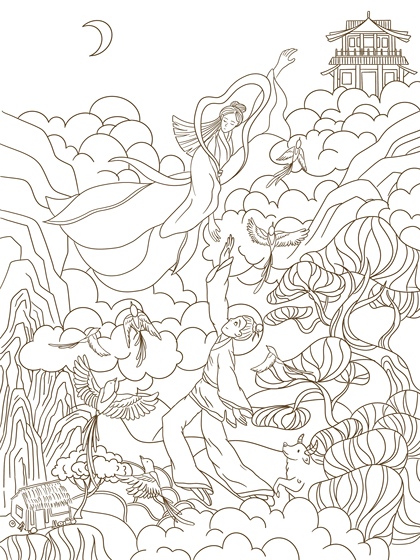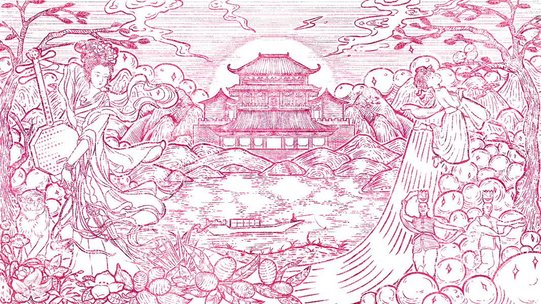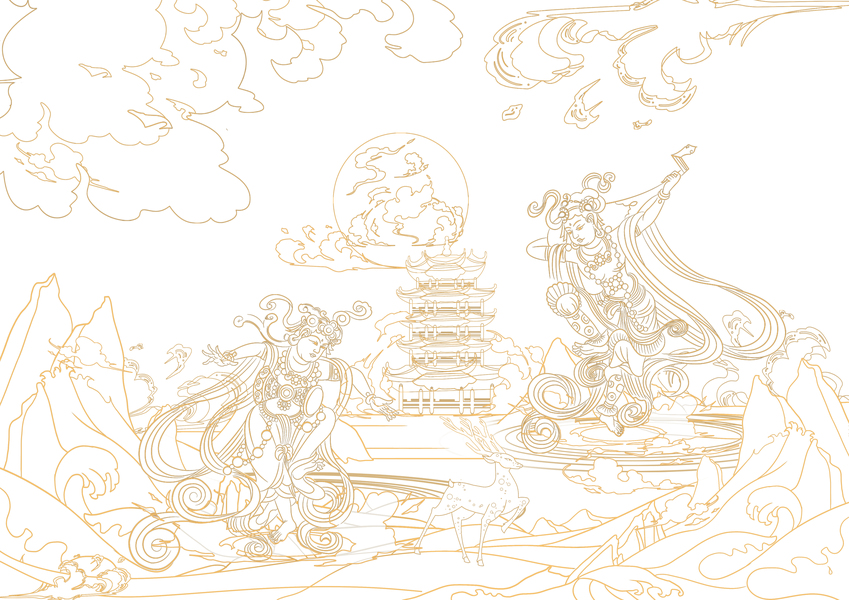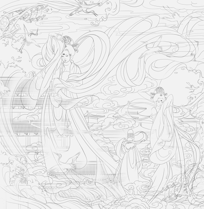 国潮插画---古风、建筑、荷花、佳丽、水流