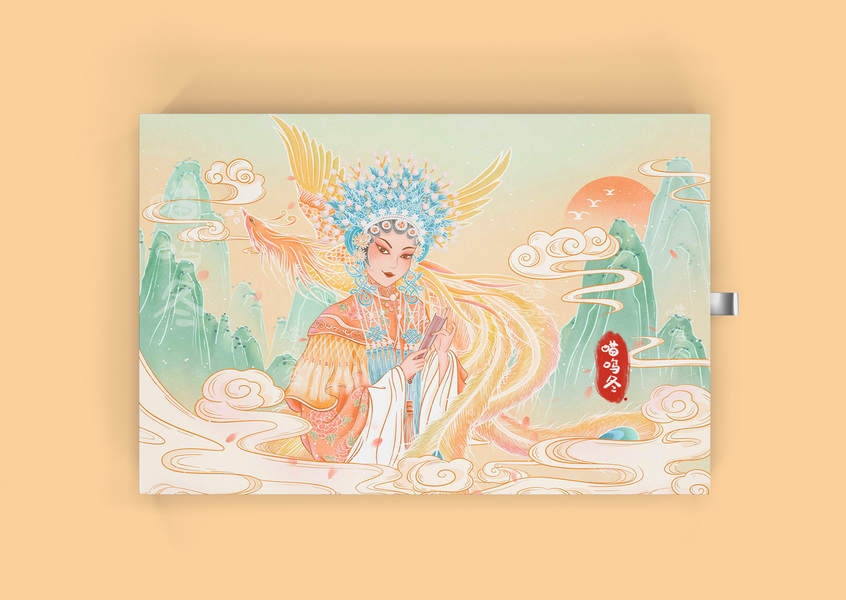 国风国潮风海报包装插画-京剧凤凰山水场景