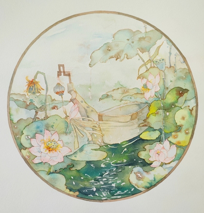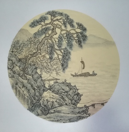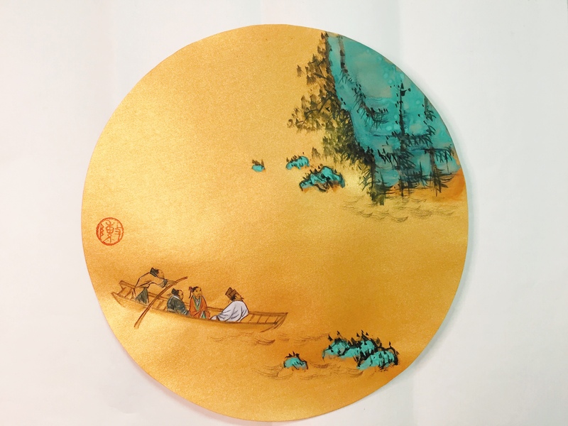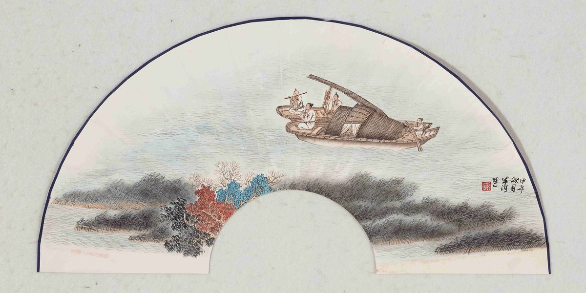 青绿山水画成扇面的样子