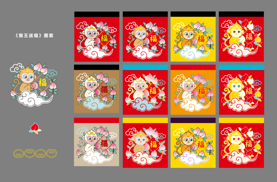 中国风卡通猴子祥云蟠桃福寿传统文化寓意儿童图案时装