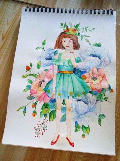 手绘水彩少女插画