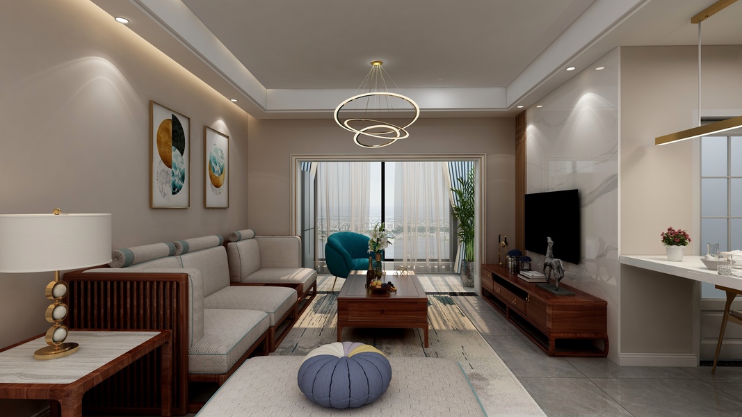 时尚新中式客厅、餐厅、厨房效果图