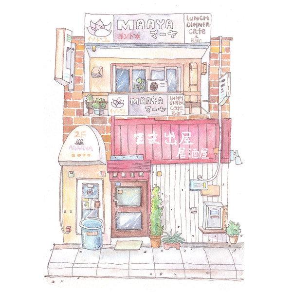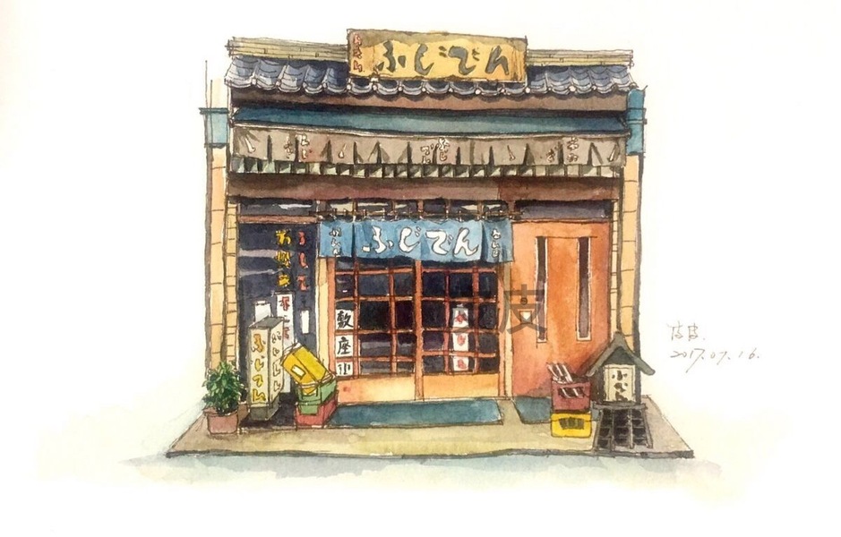 水彩手绘,日式建筑,日式店铺小房子,钢笔淡彩(二)