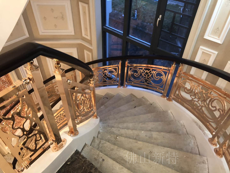 别墅旋转铝艺金色楼梯围栏高难度制作