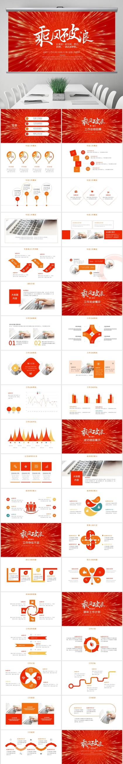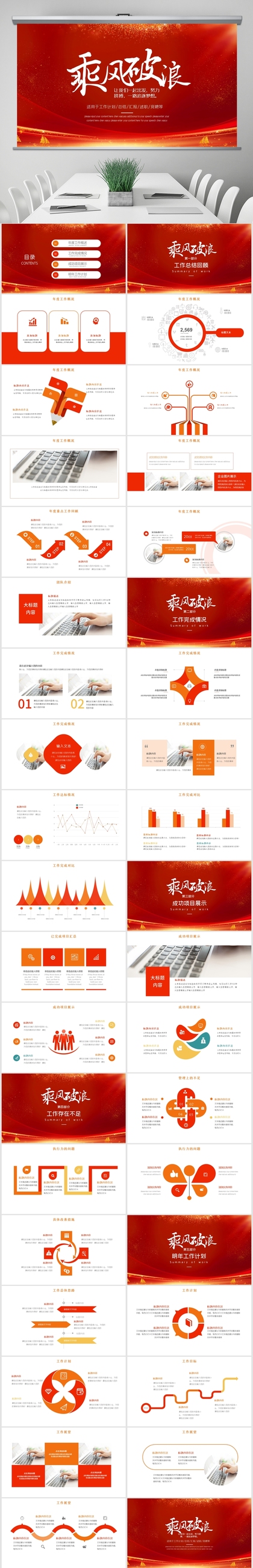 乘风破浪主题红色炫酷励志简约精美工作总结PPT模板