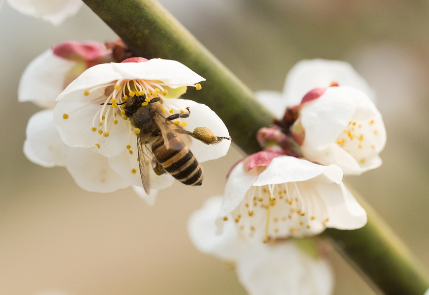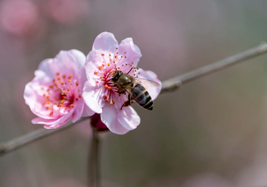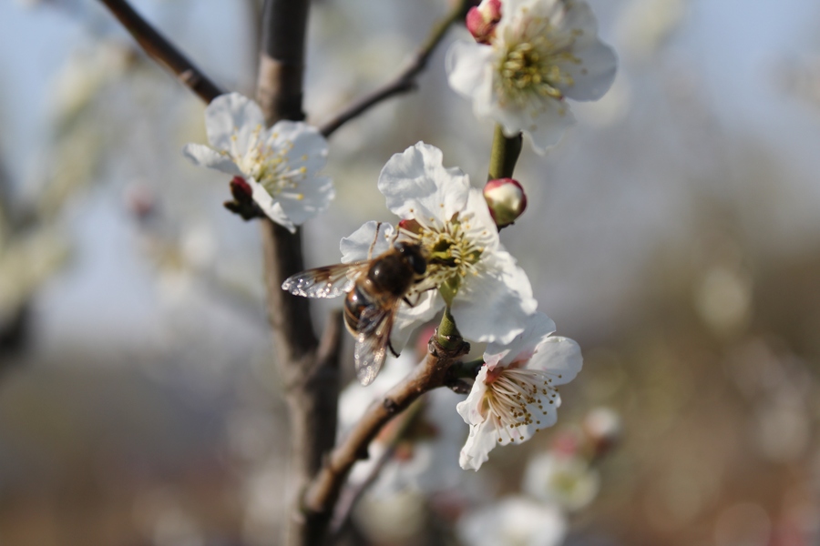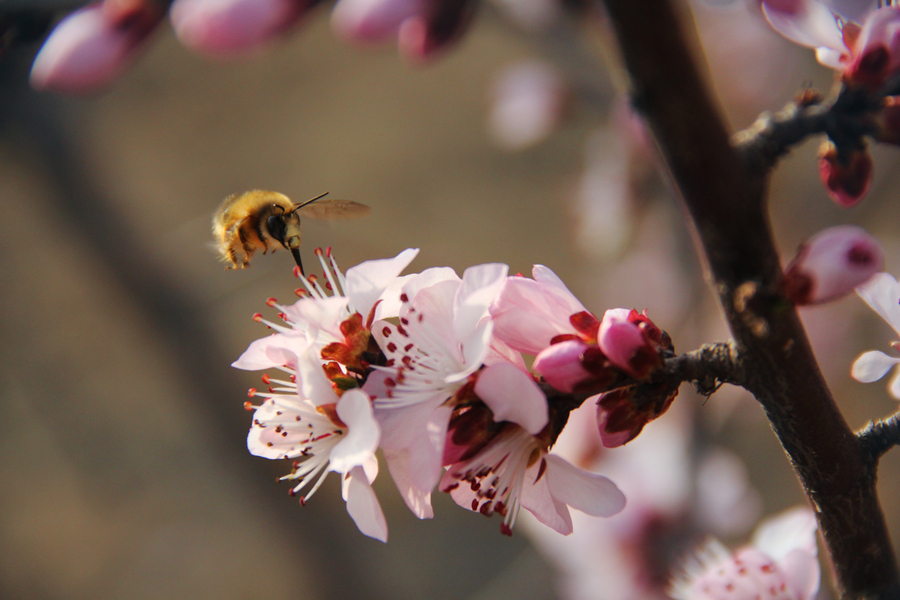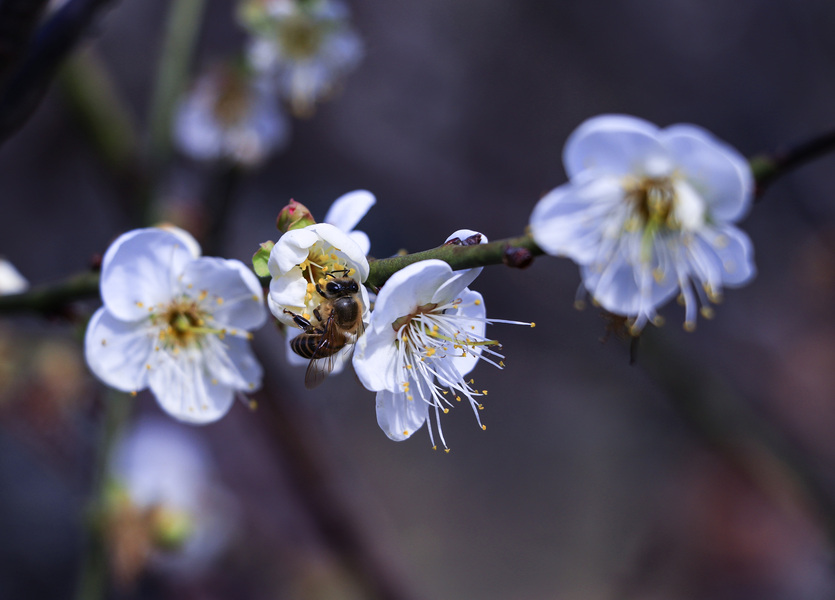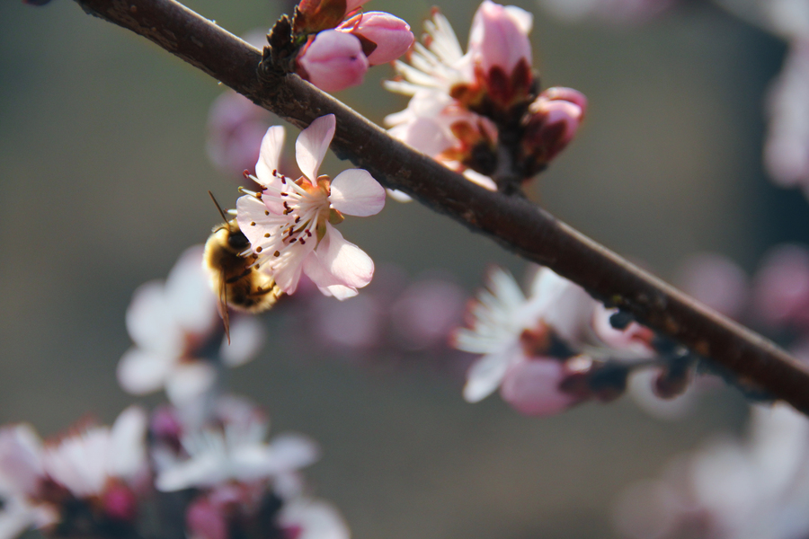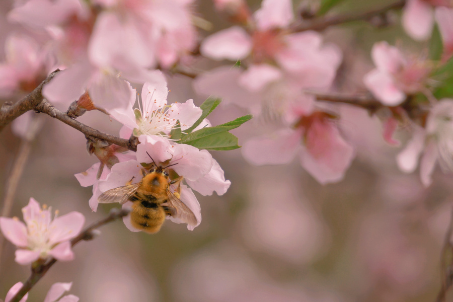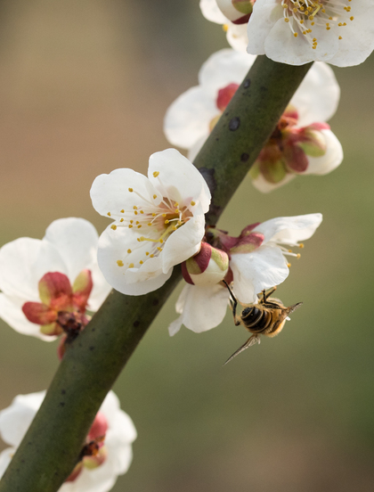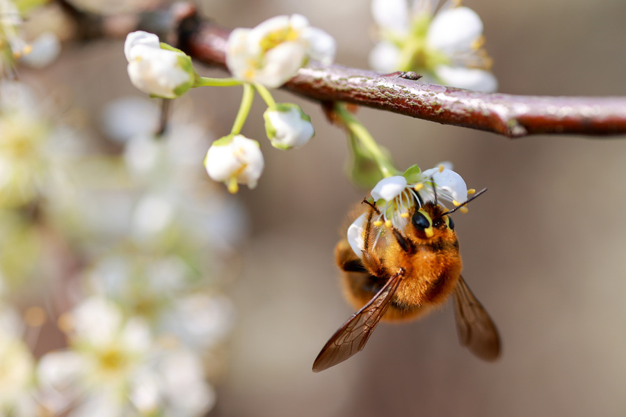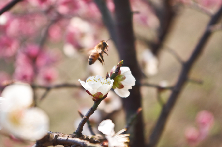 肥嘟嘟毛茸茸的蜜蜂与李花