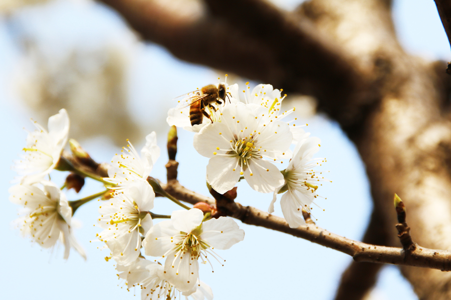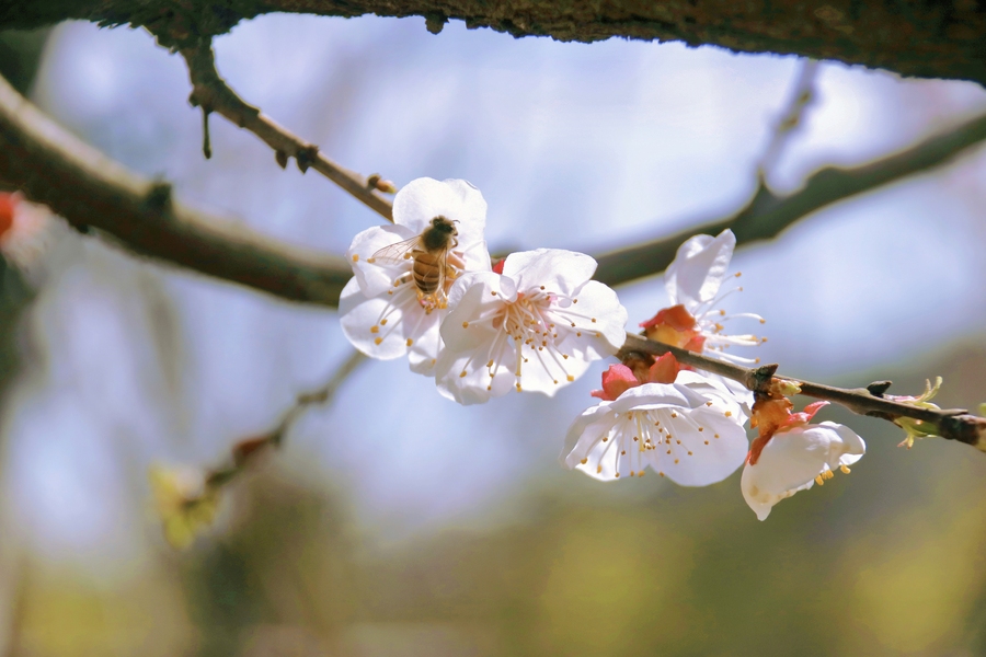 肥嘟嘟毛茸茸的蜜蜂与李花
