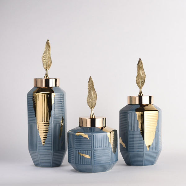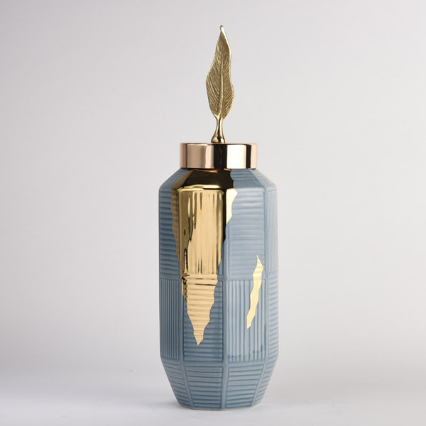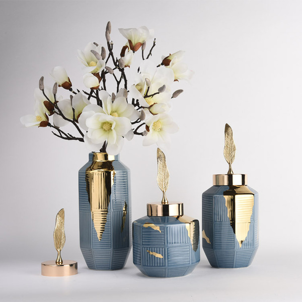 时语轻奢陶瓷摆件花瓶铜叶金属盖饰品摆件
