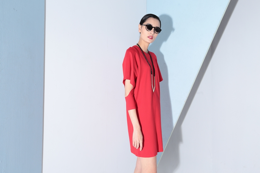 【原创品质】2016夏新品欧美范中性H型廓形七分袖连衣裙露肘圆领