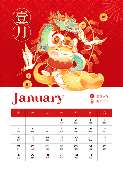 红金色卡通国潮风2025蛇年日历(竖版)