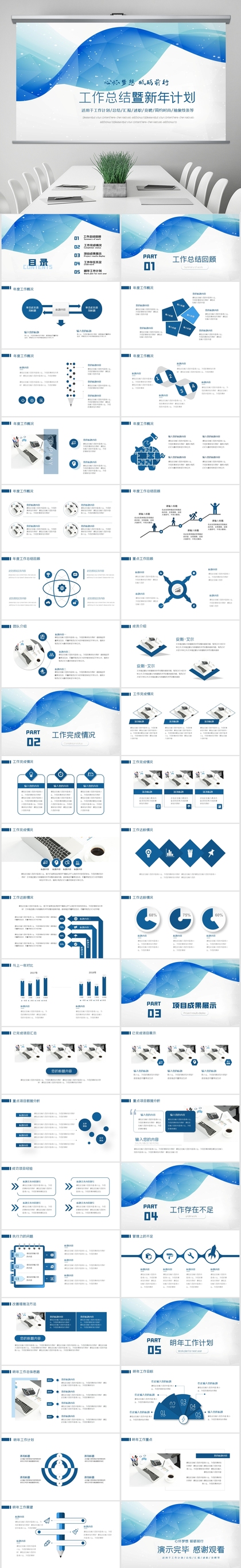 简洁实用蓝色商务工作总结计划项目汇报通用PPT模板