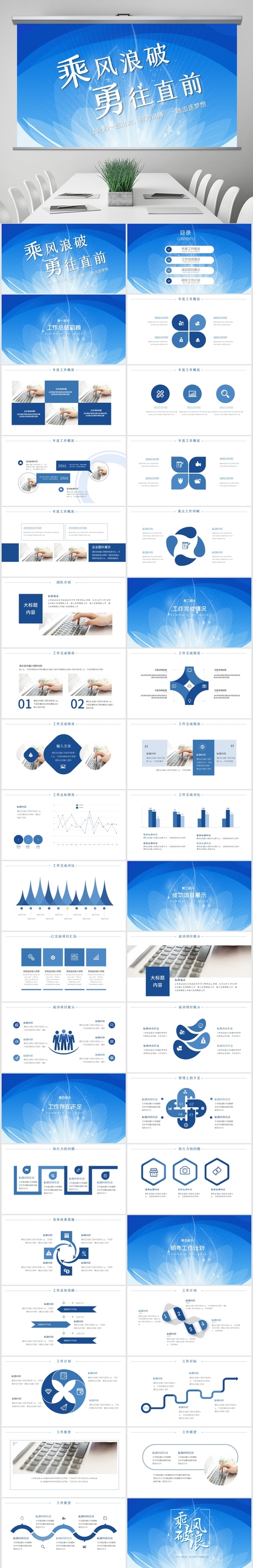 乘风破浪主题蓝色简约精美工作总结岗位竞聘PPT模板
