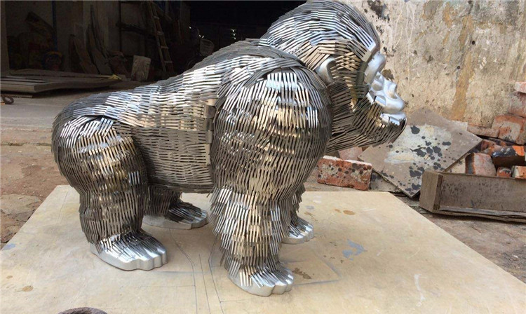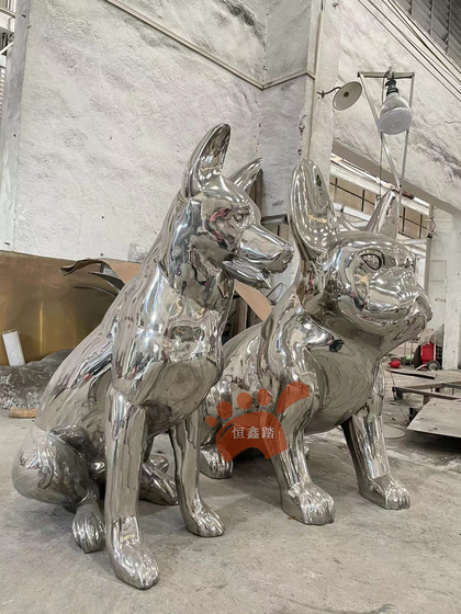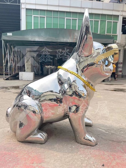 酒店镜面不锈钢雕塑小品手工锻造不锈钢仿真法斗犬雕塑