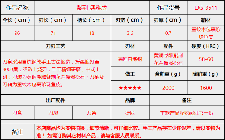 德匠堂宝剑-龙泉刀剑-新款明刀雁翎刀之紫荆(LJG-3511)