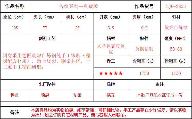 德匠堂宝剑-龙泉刀剑-新款-兽纹秦剑—典藏版