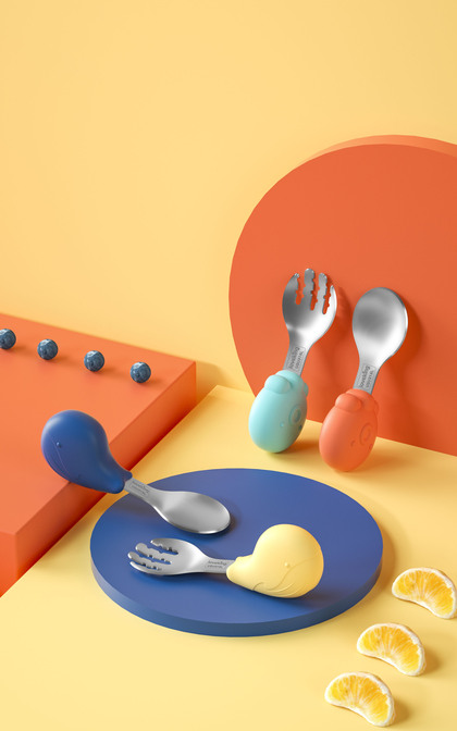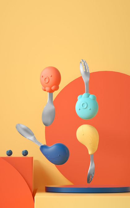 【母婴用品】宝宝恐龙短柄叉勺套装详情渲染设计