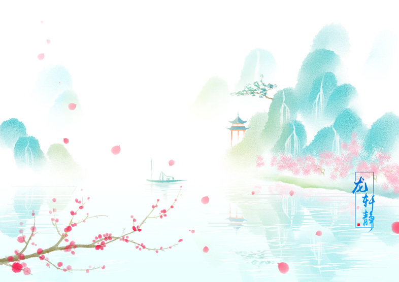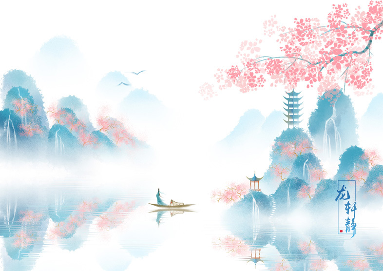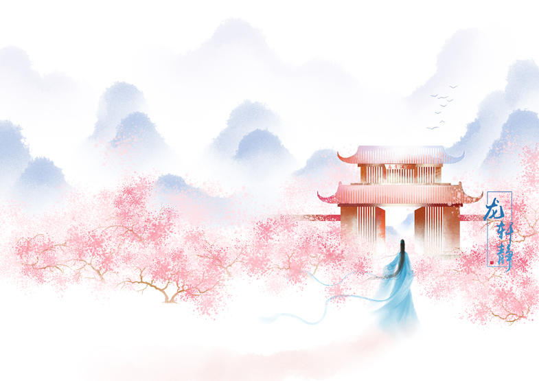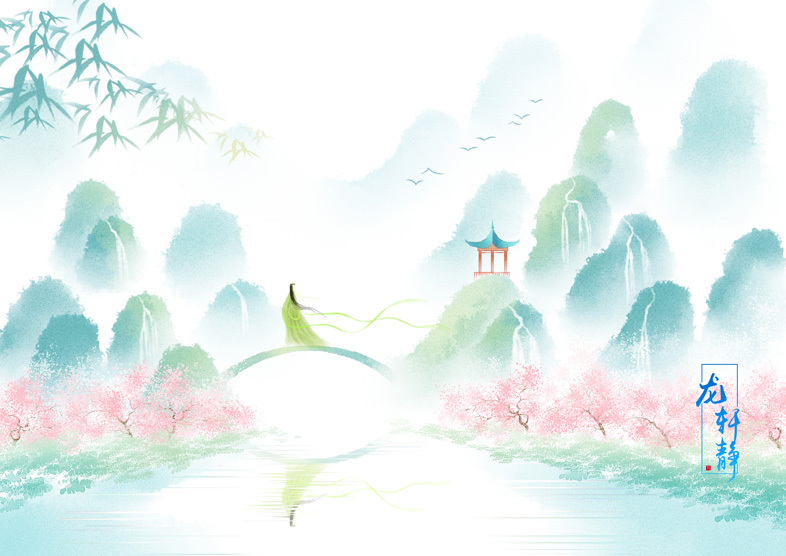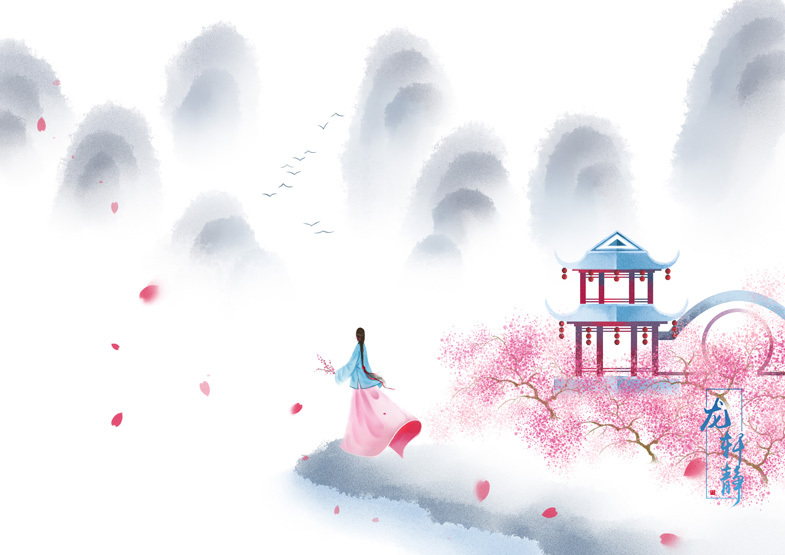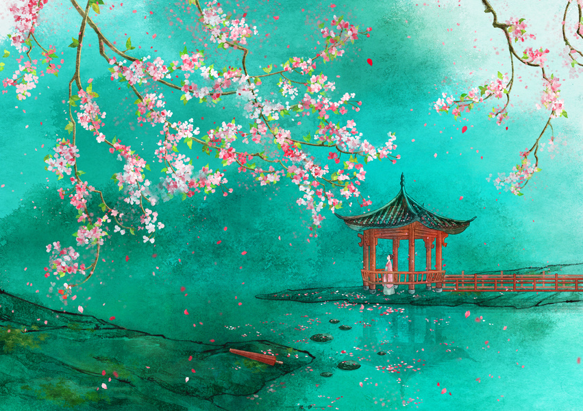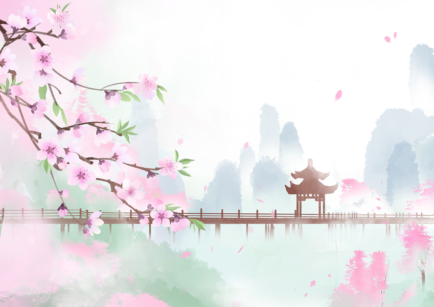 古风意境插画古建筑凉亭汉服女子春天桃花水墨山水