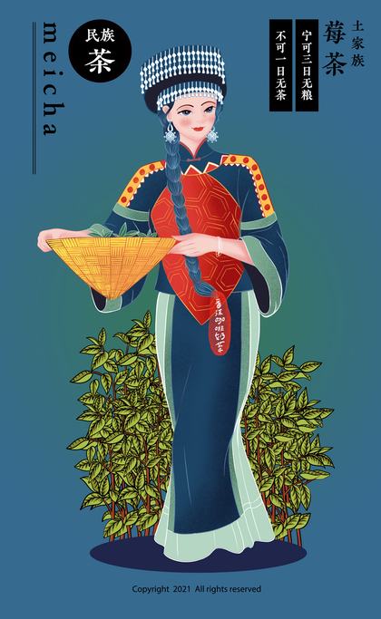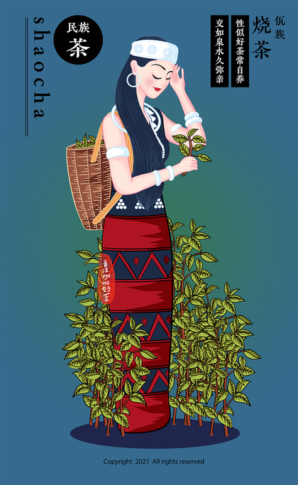 手绘春天少数民族少女采摘茶叶生活插画