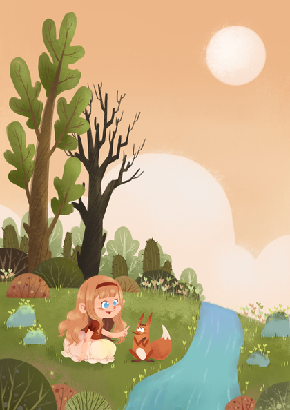 小女孩和小狐狸 欧美风儿童插画