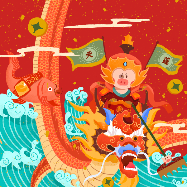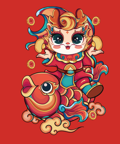 虎年插画-虎头娃娃骑布老虎