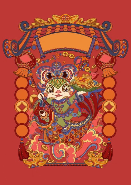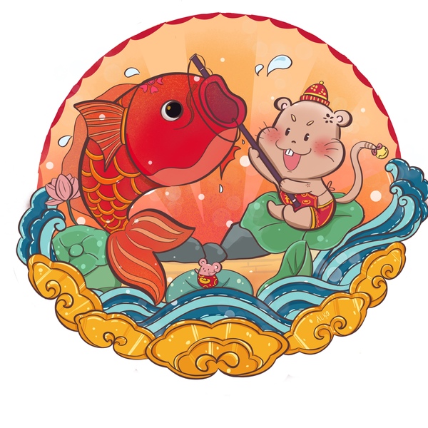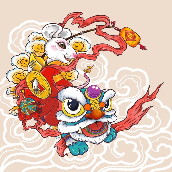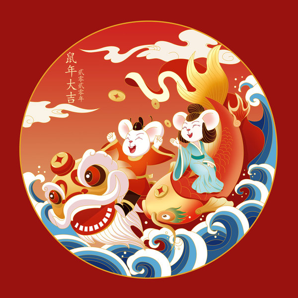2020鼠年插画鼠年大吉中国风舞狮锦鲤过海拜年图
