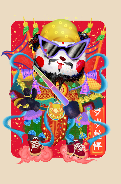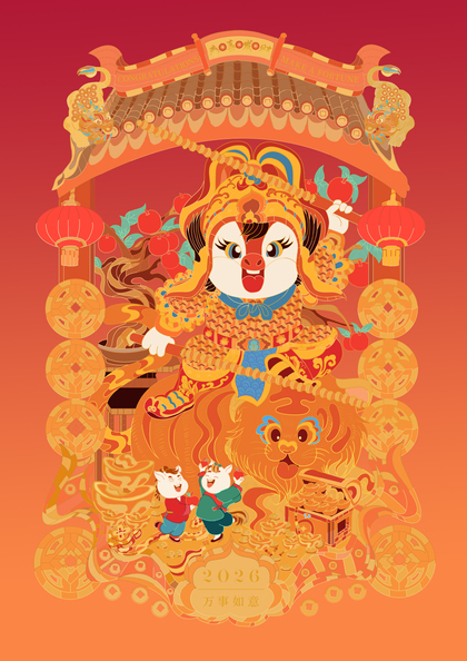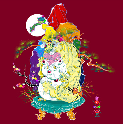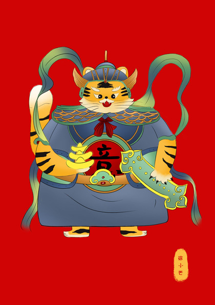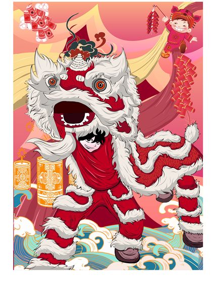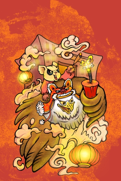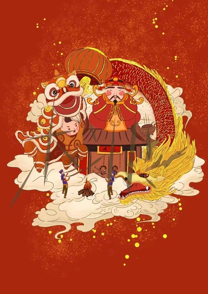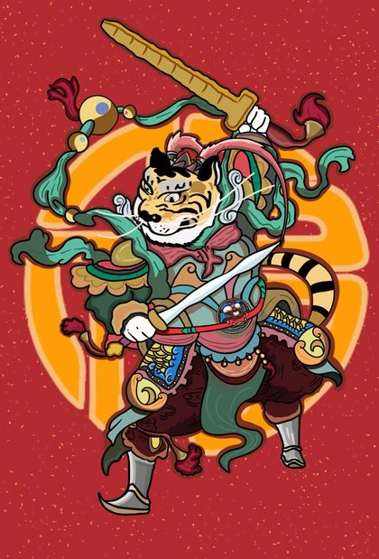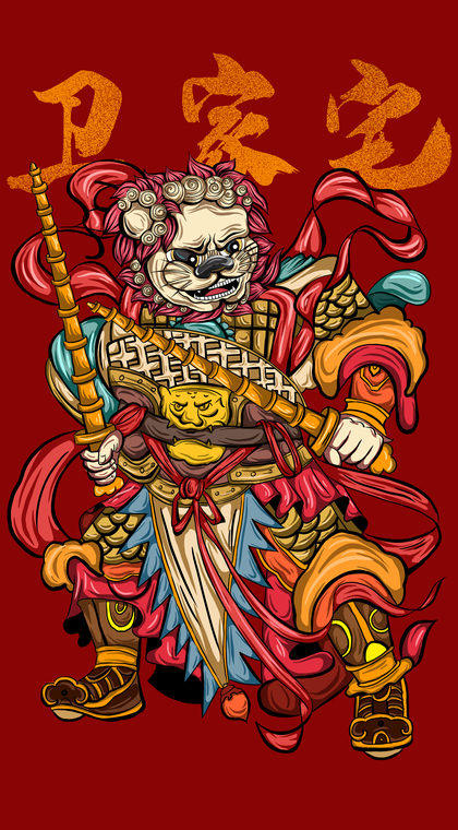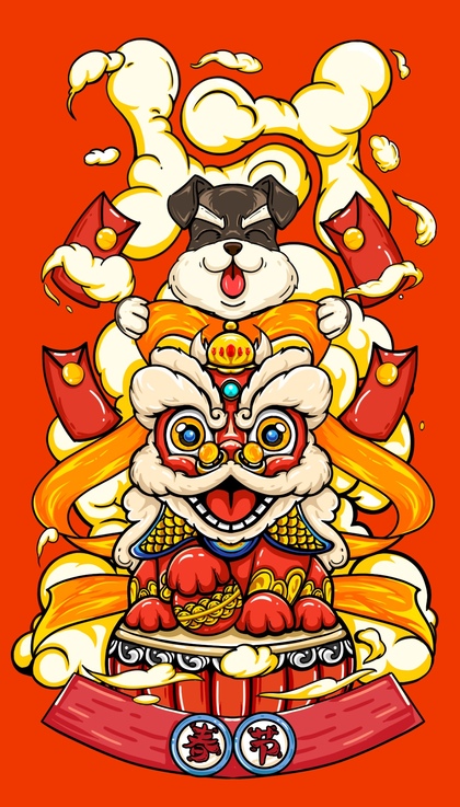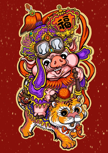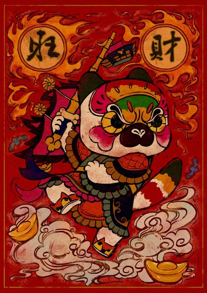 风俗年画之狗狗门神(黑的是阿拉斯加、黄的是柴犬)