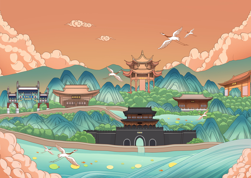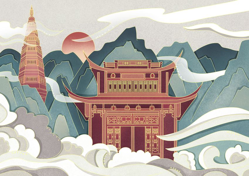 山水建筑风景插画