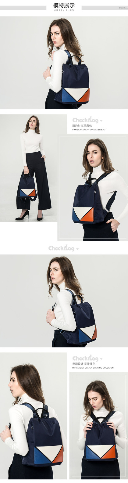 格子旗新款双肩包双拉链闭合尼龙配头层牛皮拼接背包