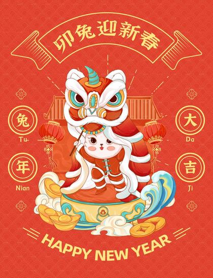 卯兔舞狮|2023兔年新年海报插画 兔子形象设计