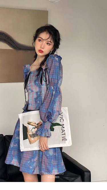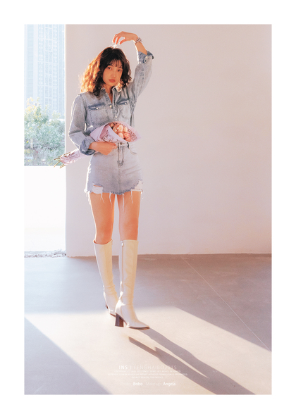 模特Kiki 牛仔连衣裙拍照 复古气质风 短款裙子拍摄