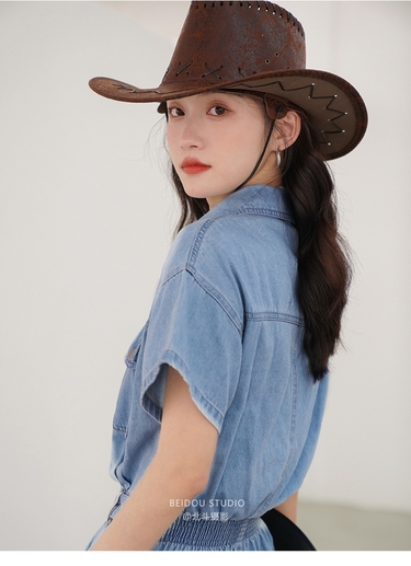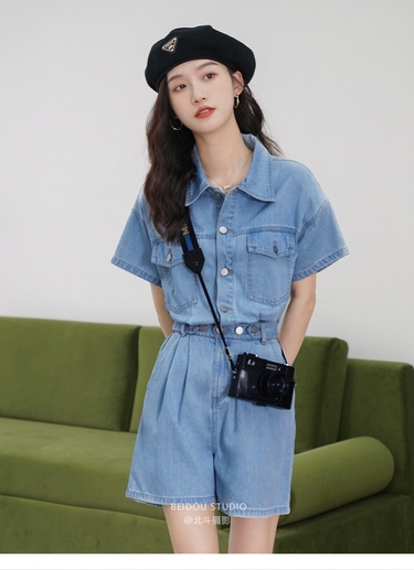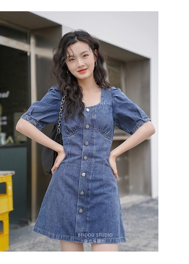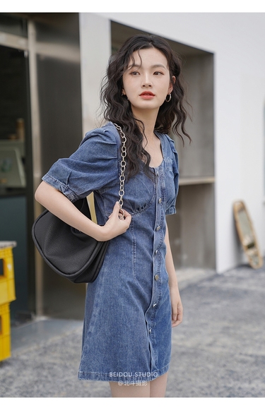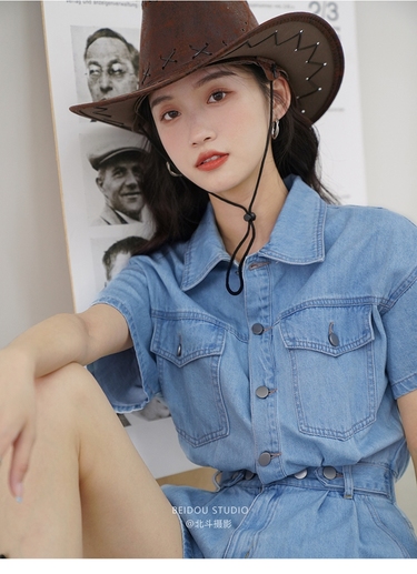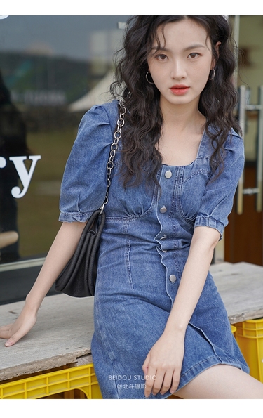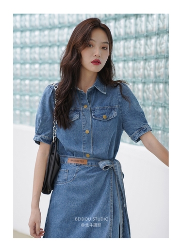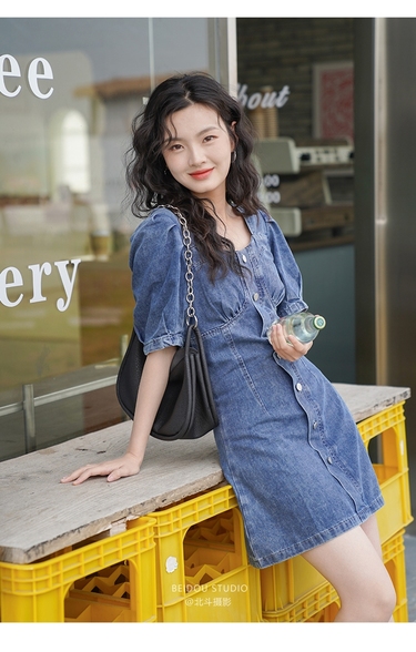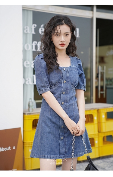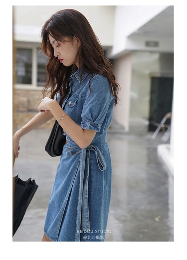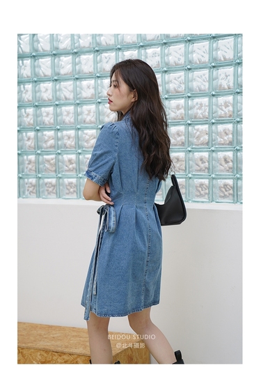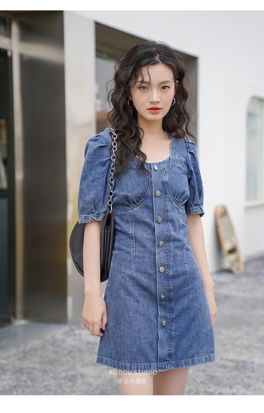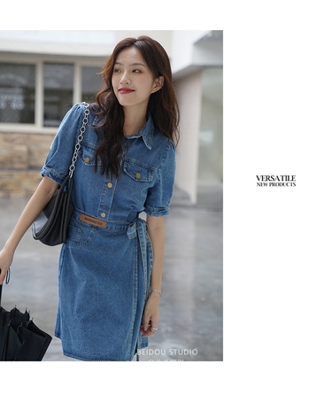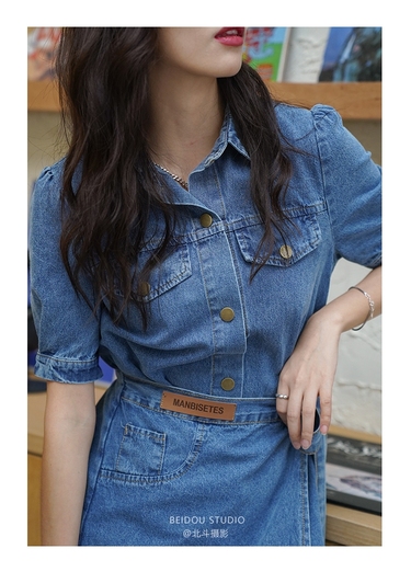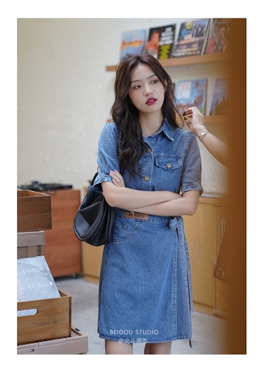 模特拍摄 短袖拍照 质复古风 牛仔连衣裙拍摄