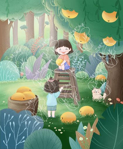 儿童插画,摘枇杷,旅游,夜晚