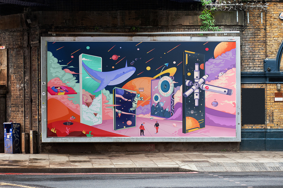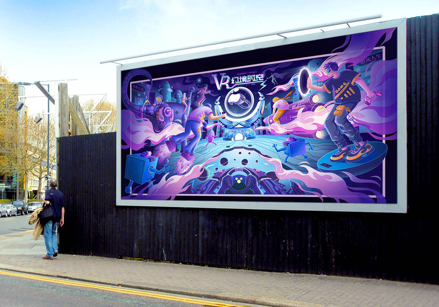 VR幻境时空主KV商业插画设计,VR眼镜游戏体验,赛博风