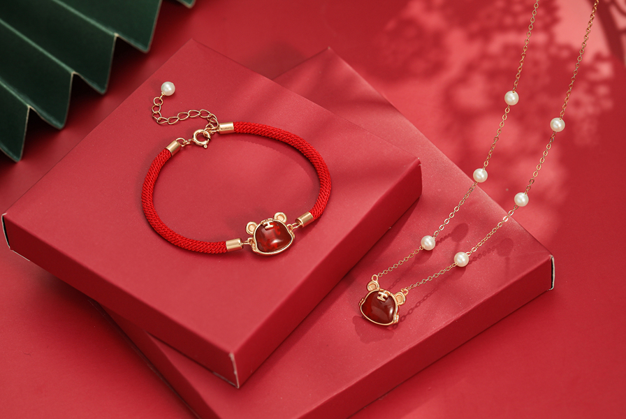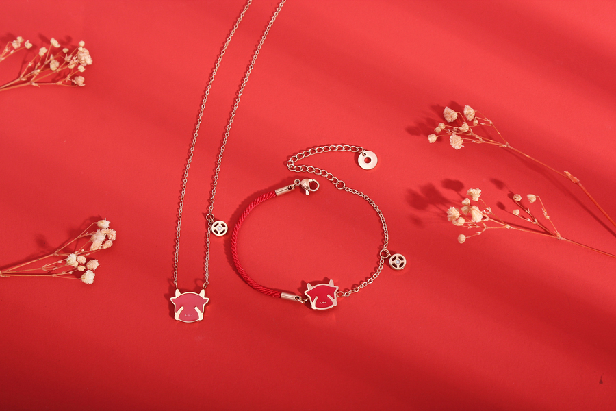 中国红 红背景 年货节 新年首饰 牛年 手链 耳钉