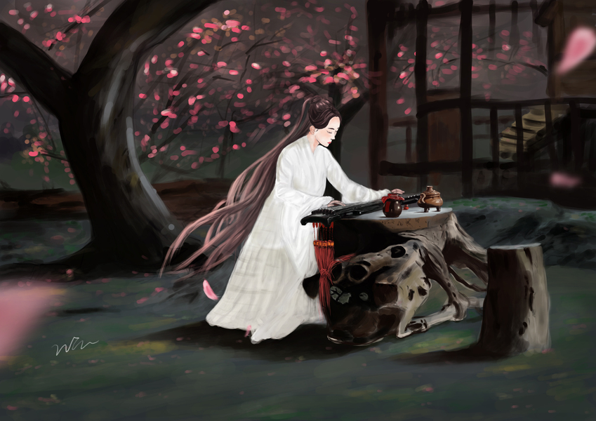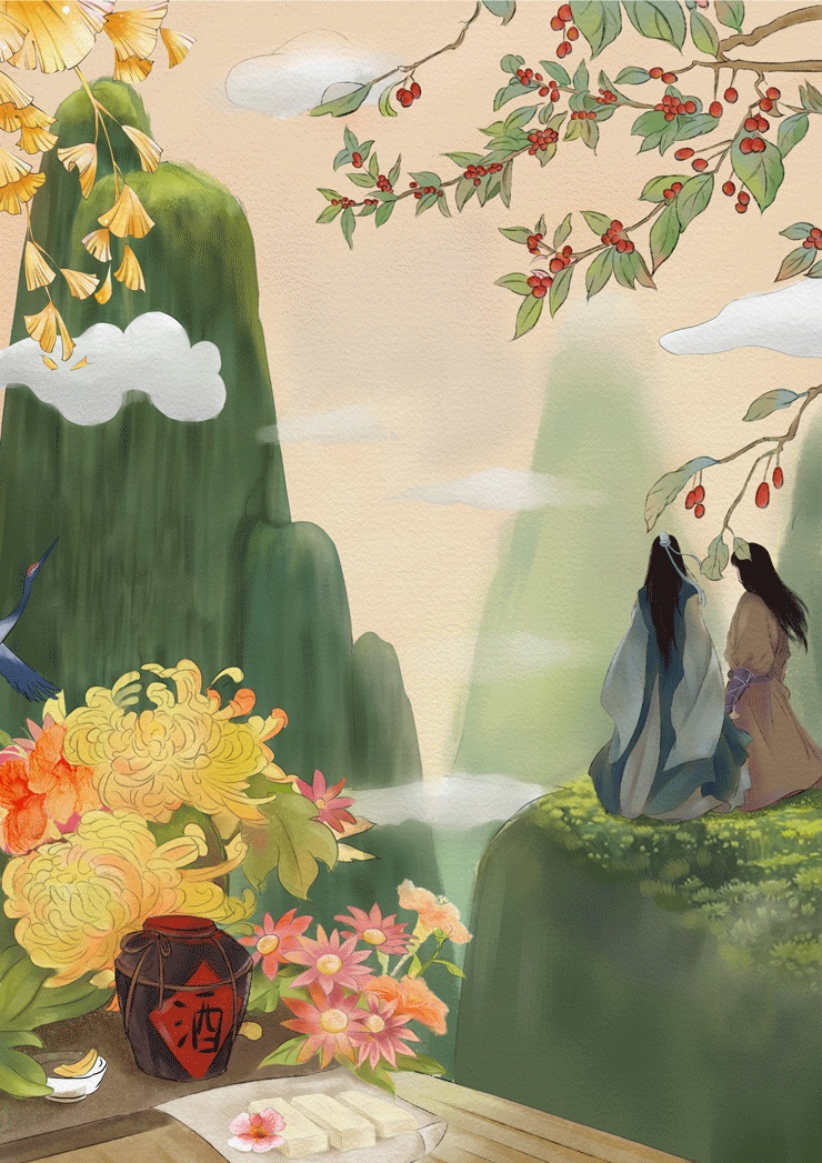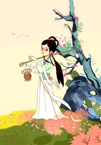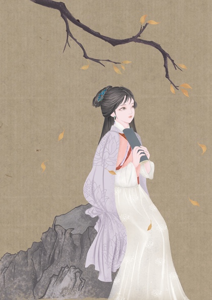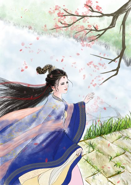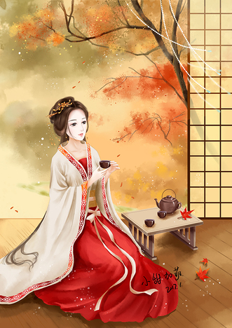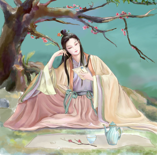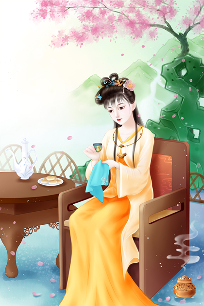 绿色古风线描花瓣奇石汉服少女饮茶矢量插图