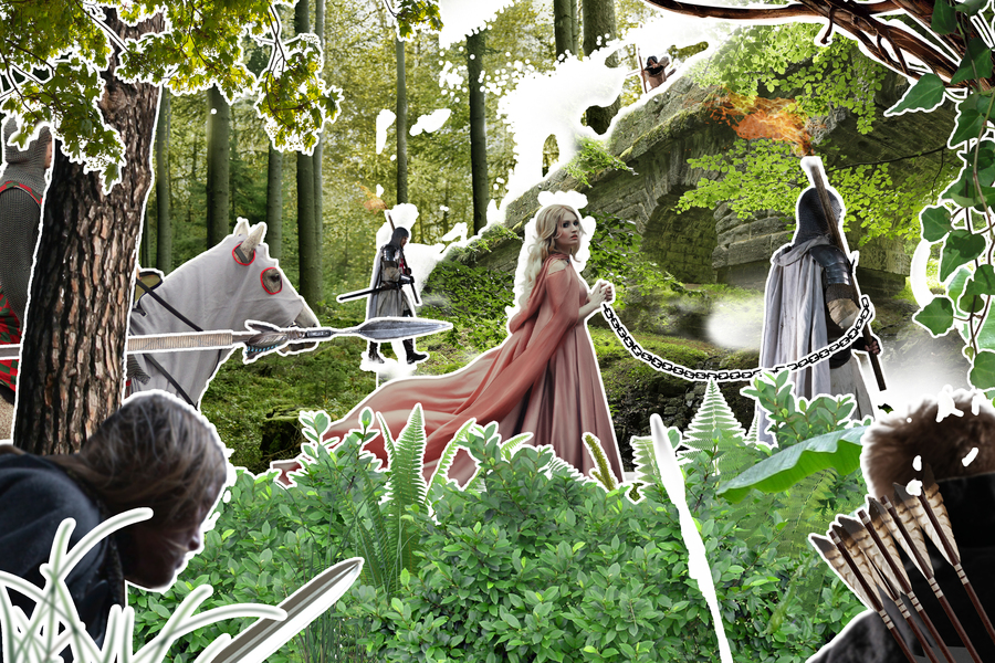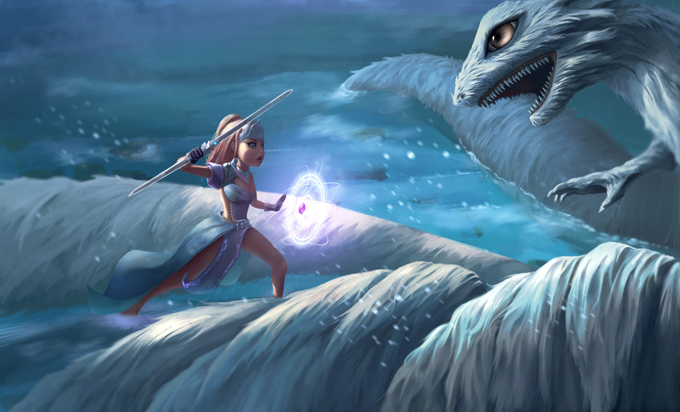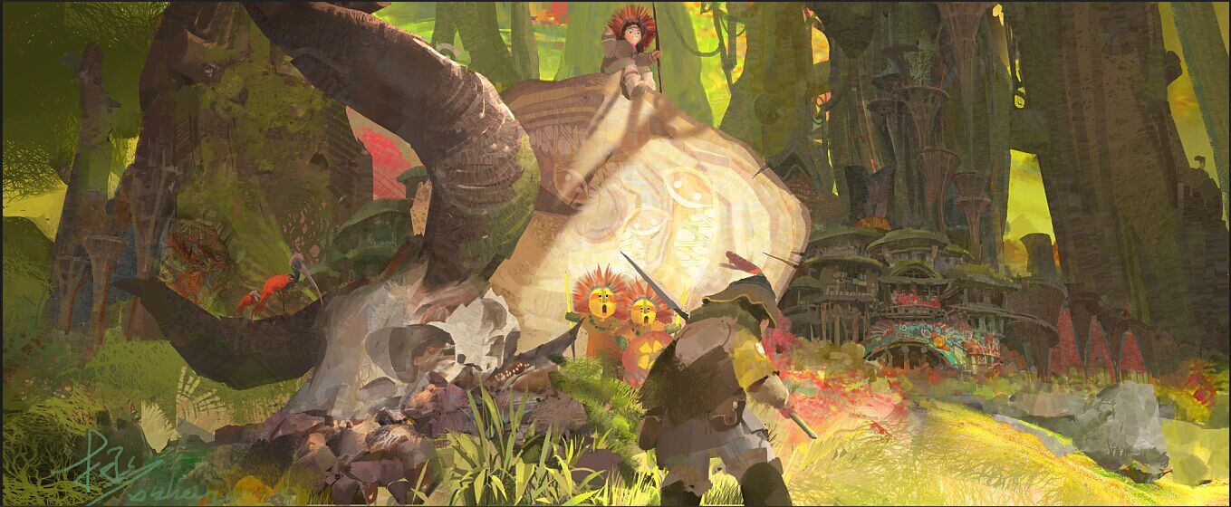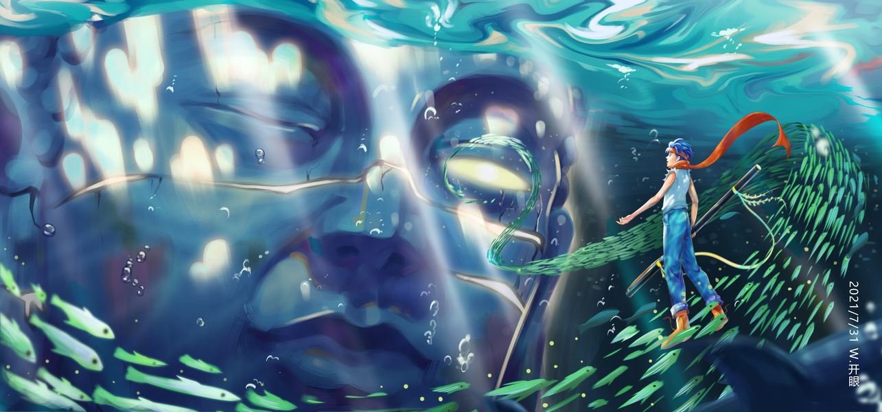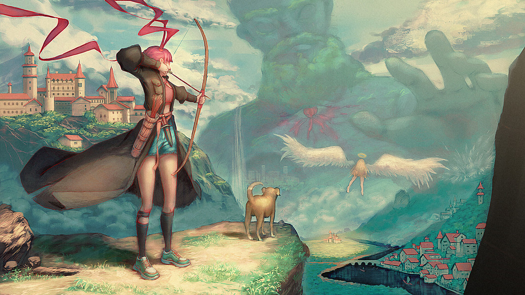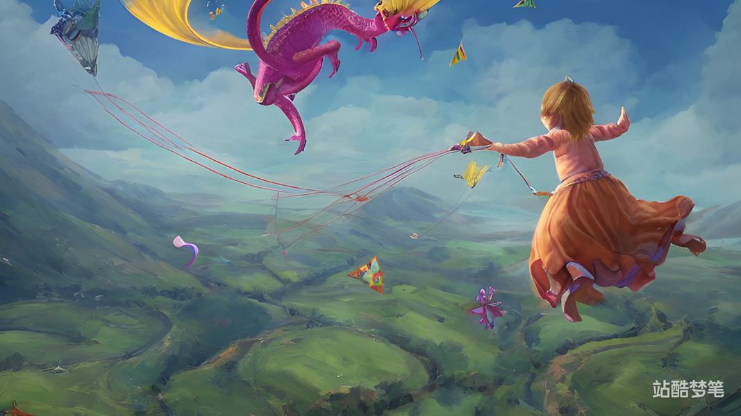 #站酷梦笔#春天里,6个小孩在放风筝,巨龙在天际盘旋
