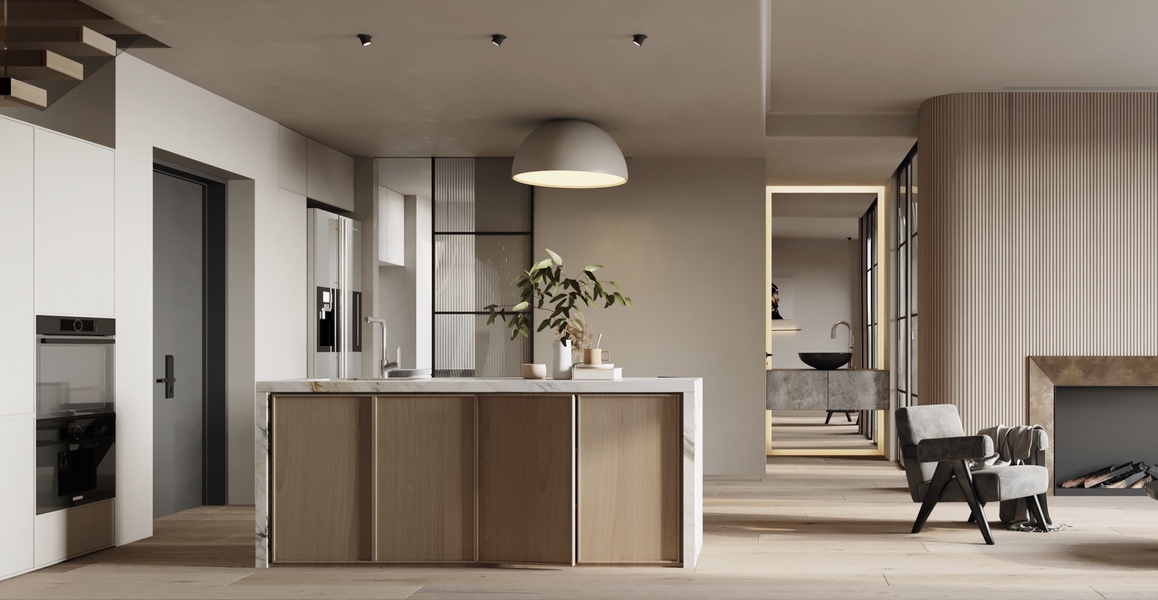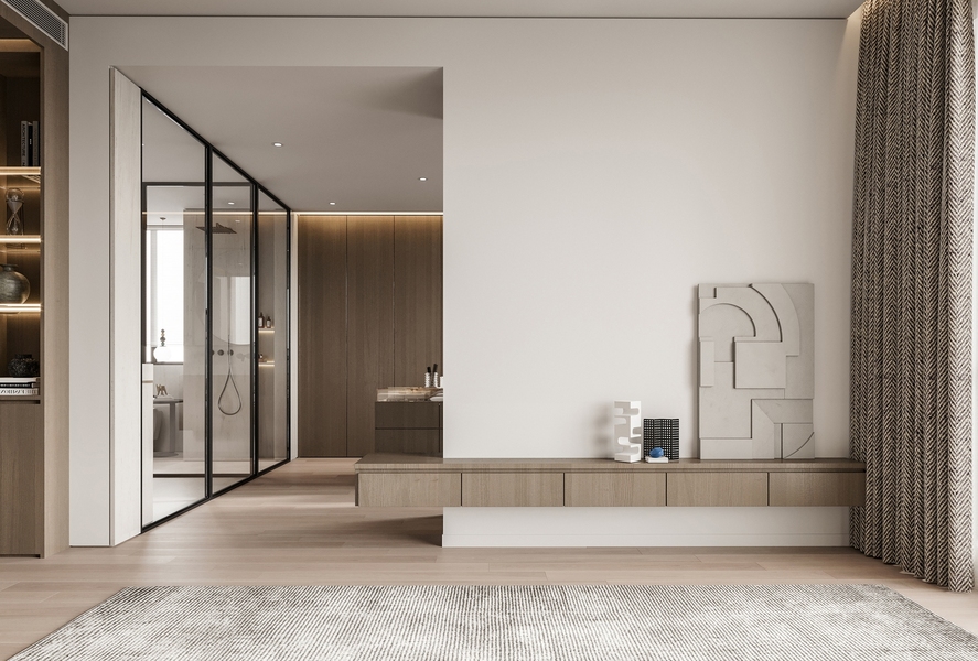 侘寂风奶油茶色别墅带庭院样板房效果图
