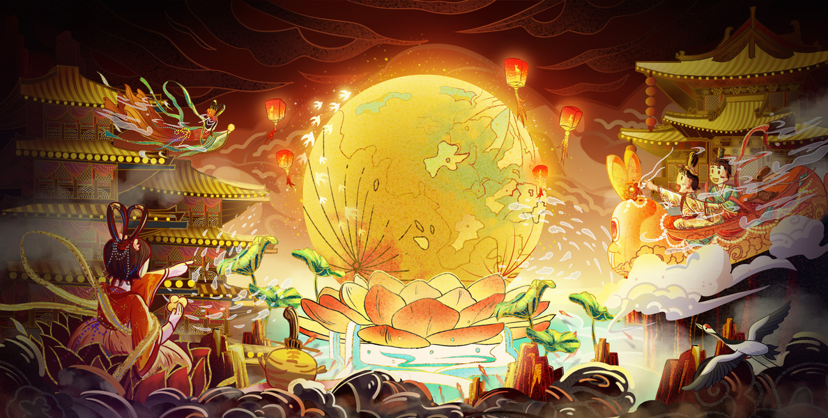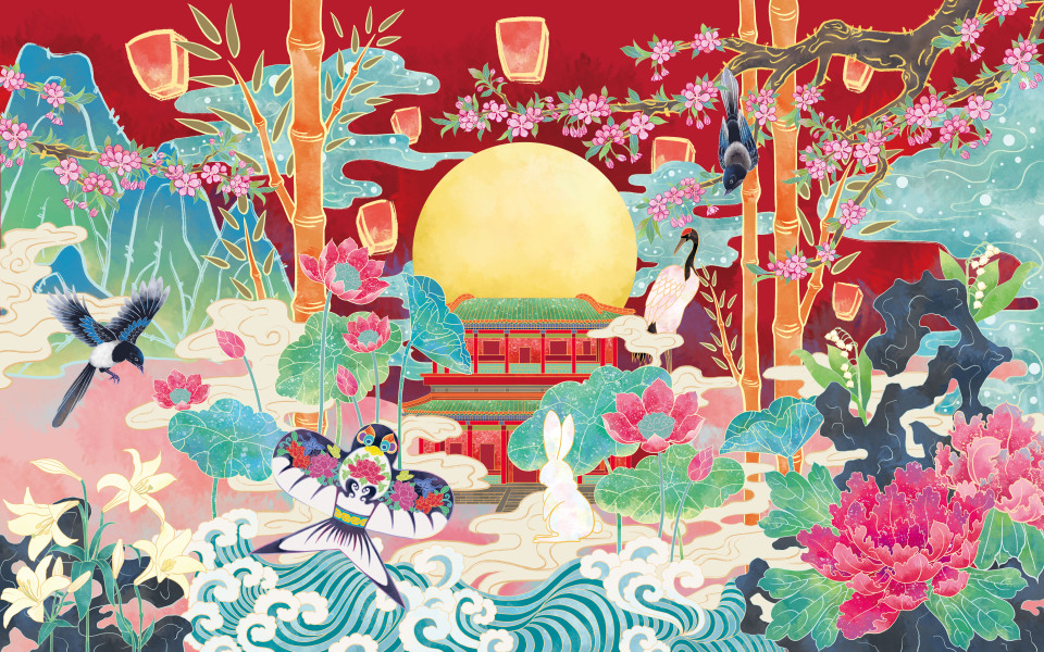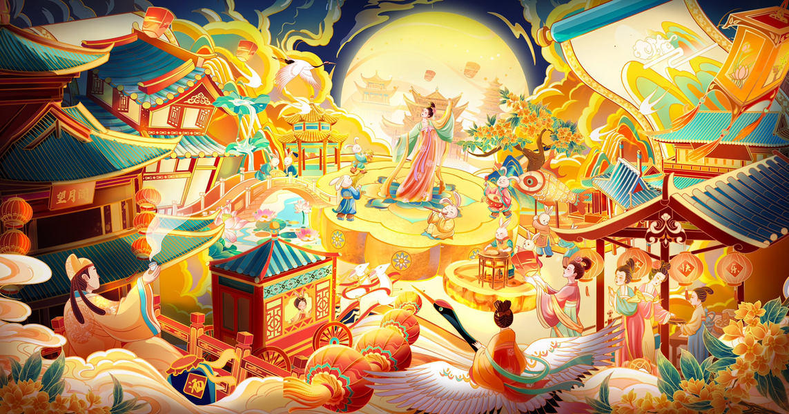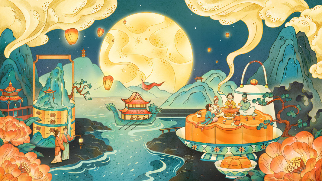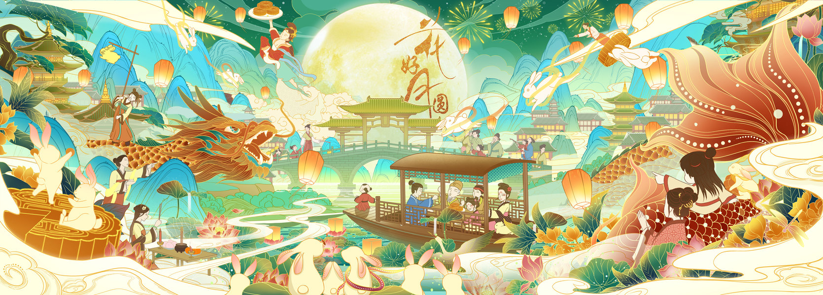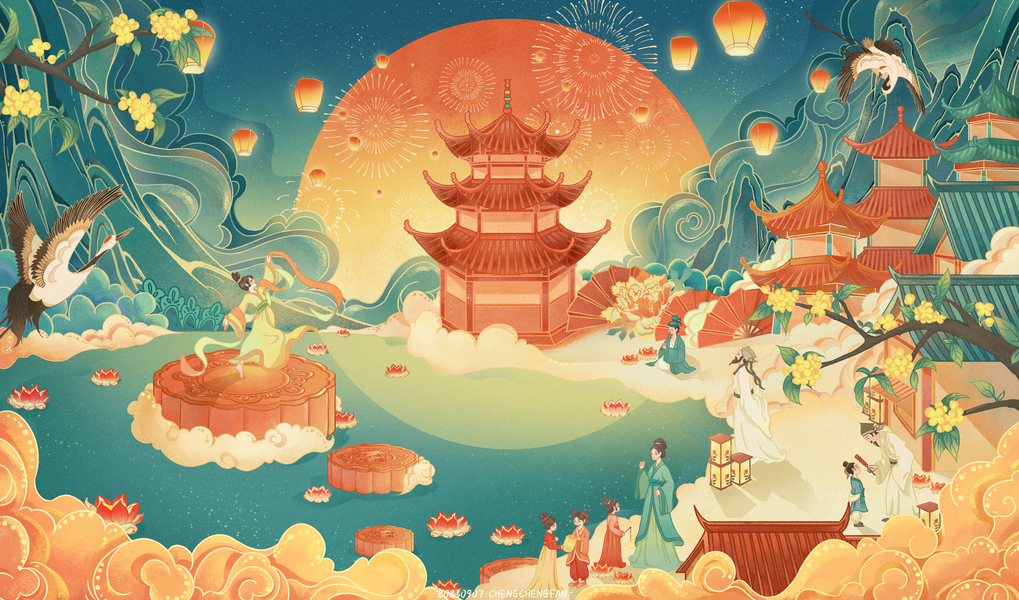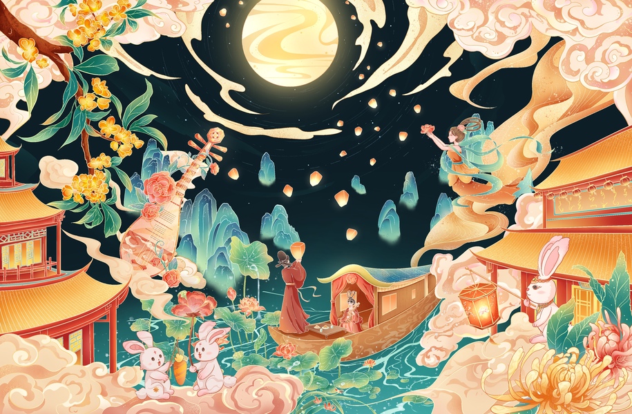 唐朝中秋节日氛围感礼品商业插画手绘包装