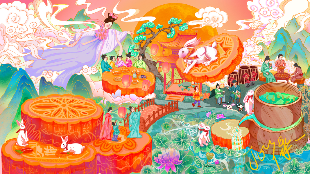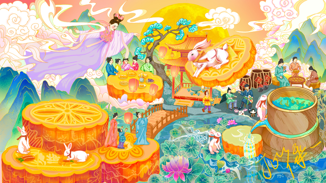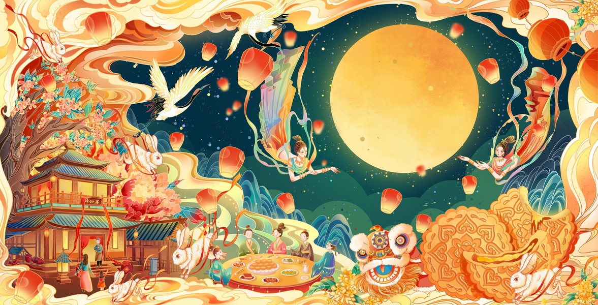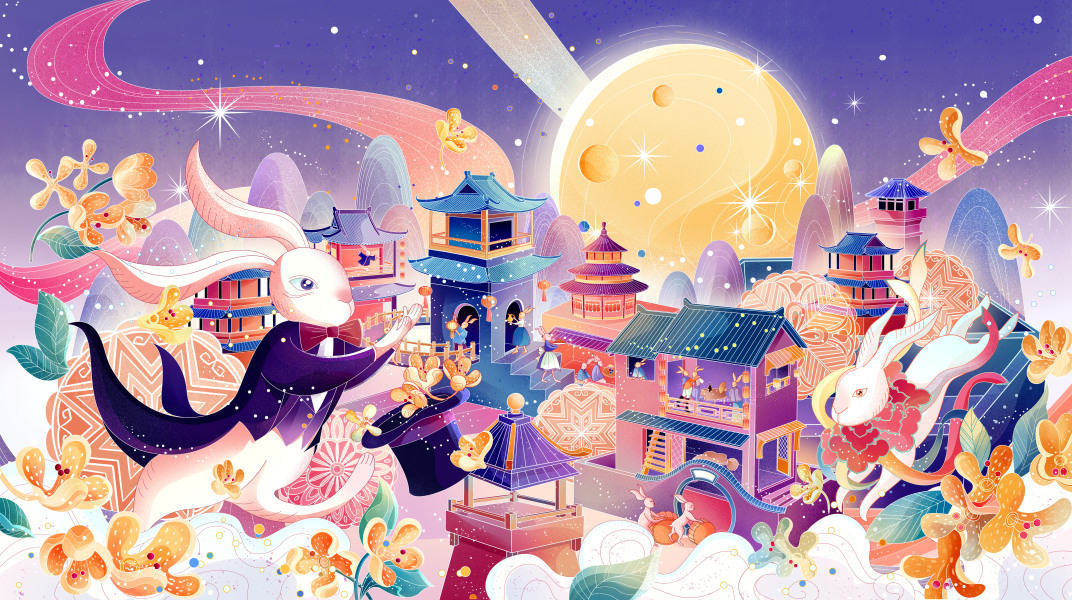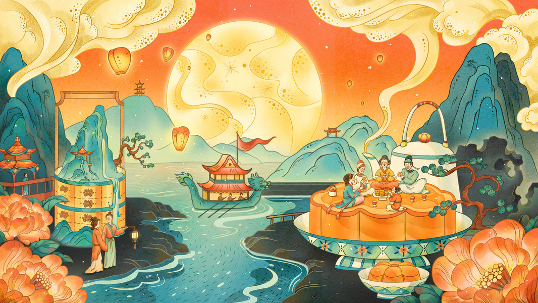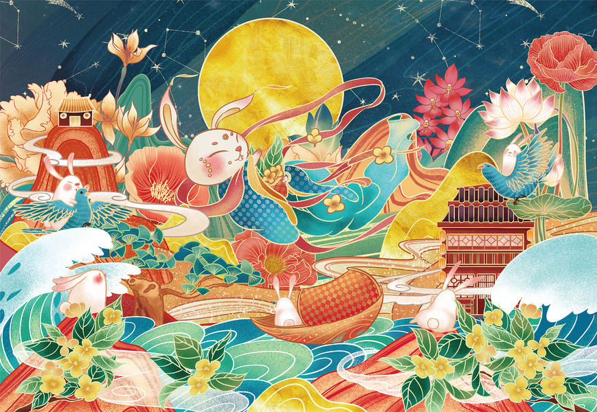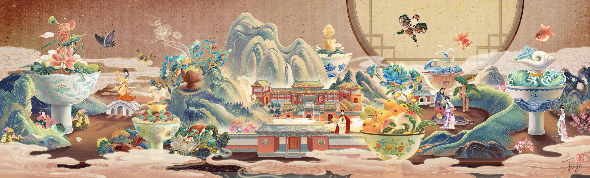 唐朝中秋节日氛围感礼品商业插画手绘包装