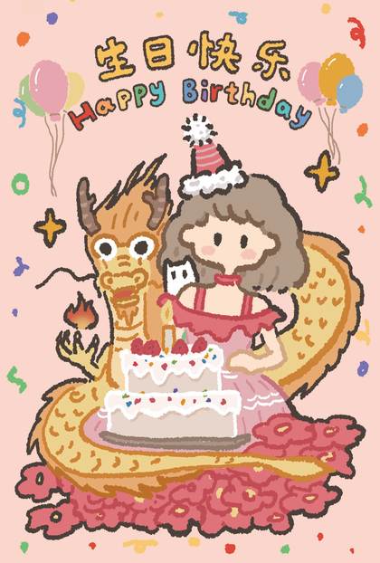 《龙来贺生》生日快乐多巴胺插画龙年生日贺图