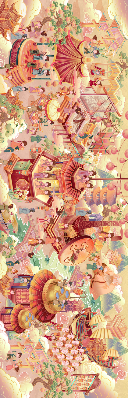贺兔年长卷 | 逛花市,游元宵,春节习俗新年插画