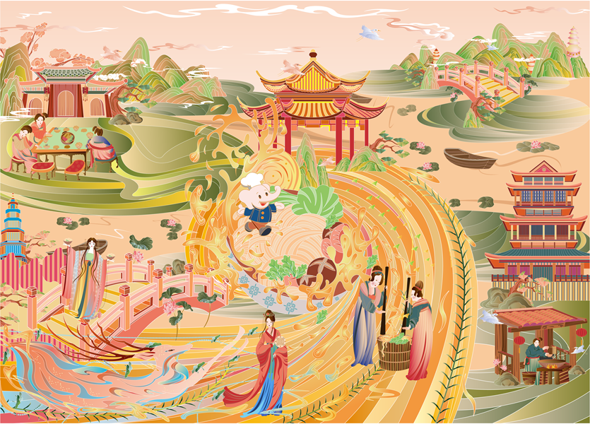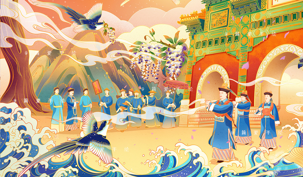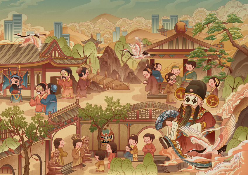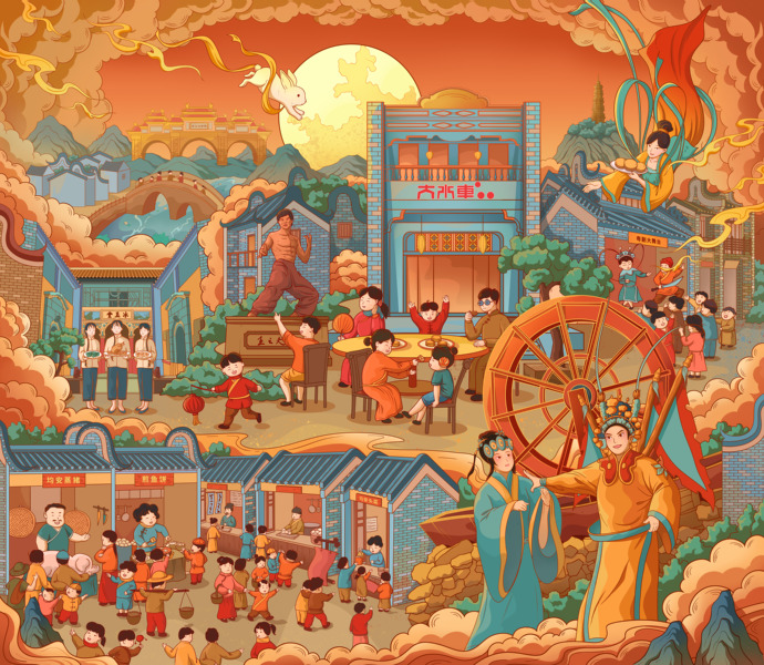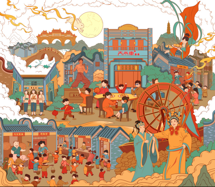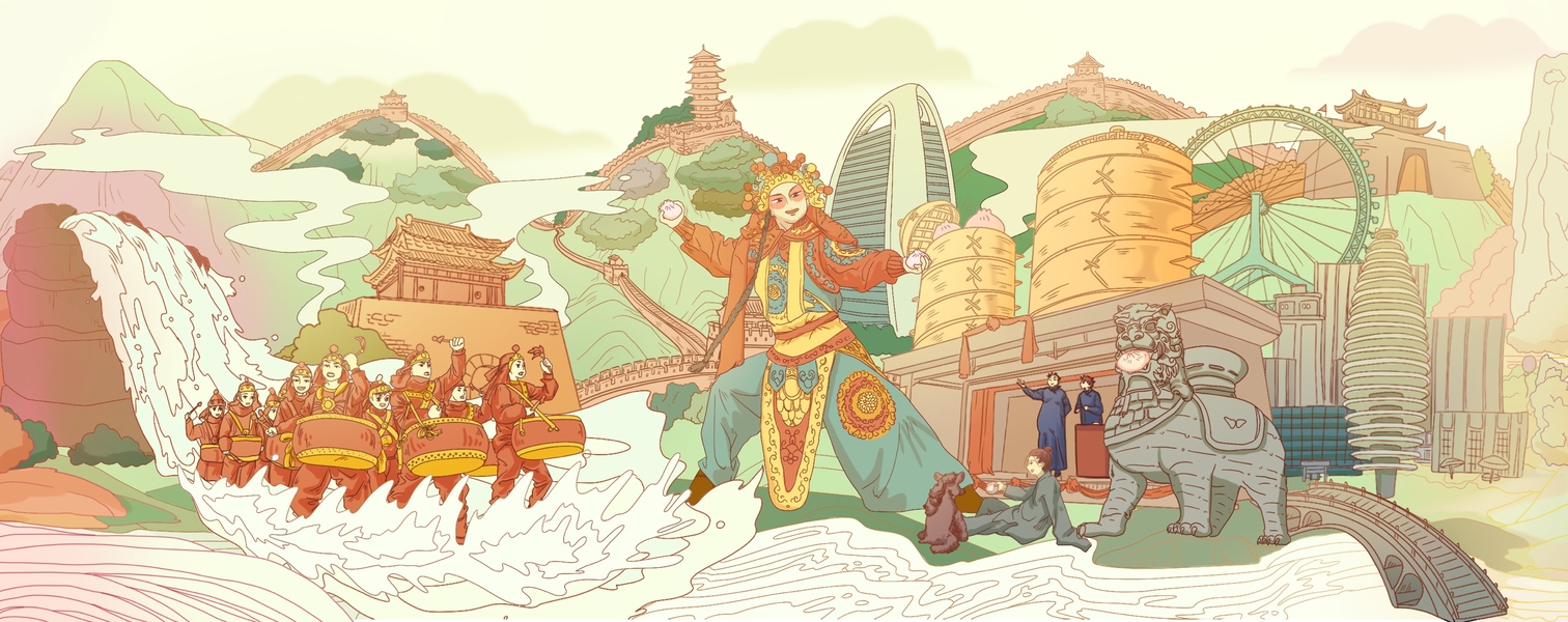 秦腔戏曲非遗长卷国潮插画——《秦腔街》