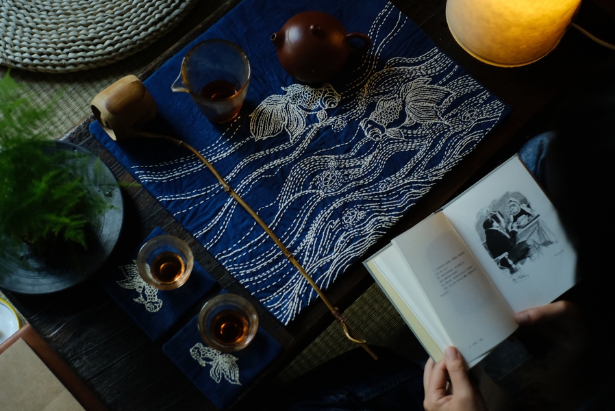 刺绣刺子绣植物蓝染手工茶垫茶席这款名为金玉满堂