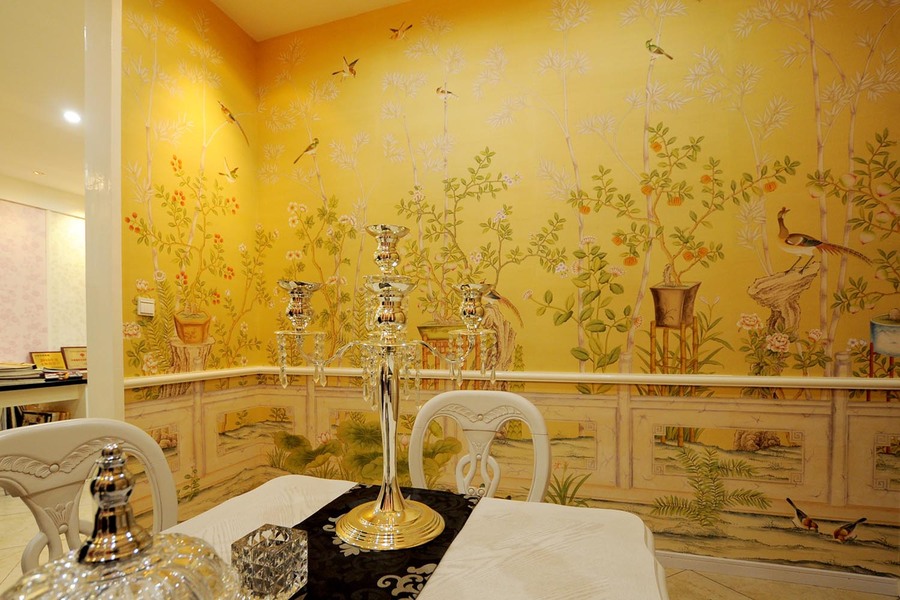 纯手工绘制的大型背景墙壁画王室真丝手绘墙纸图片