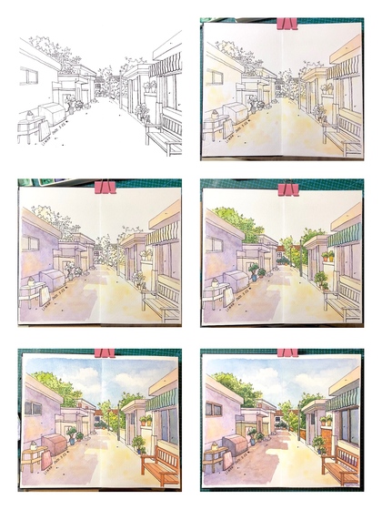 温暖的街道钢笔淡彩插画水彩画